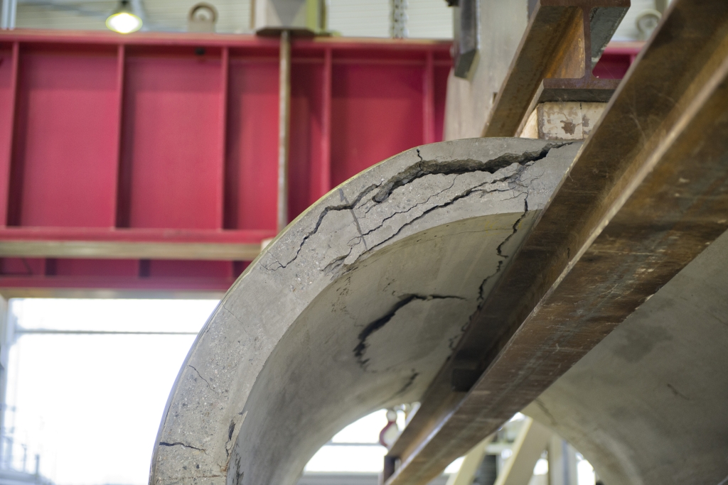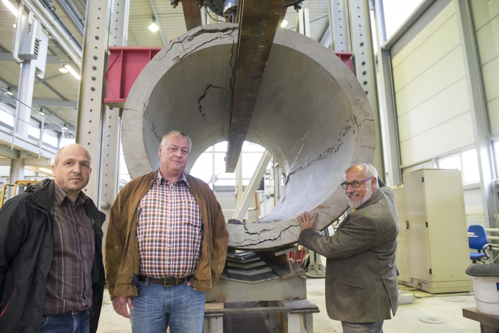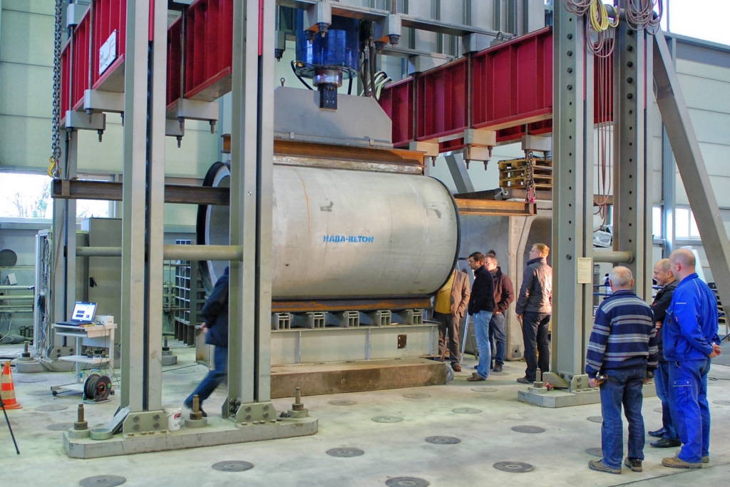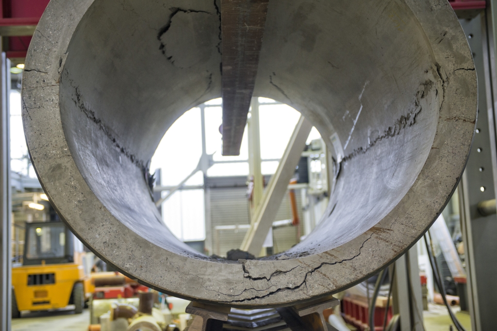 Erst knackt es leise, dann immer lauter. Die ersten Risse zeigen sich. Dann erhöht der mächtige 4.000-kN-Zylinder den Druck auf das große Stahlbetonrohr. Betonbrocken prasseln auf den Hallenboden. Zum Schluss gibt des ganze Rohr nach. Tiefe Risse klaffen im Beton.