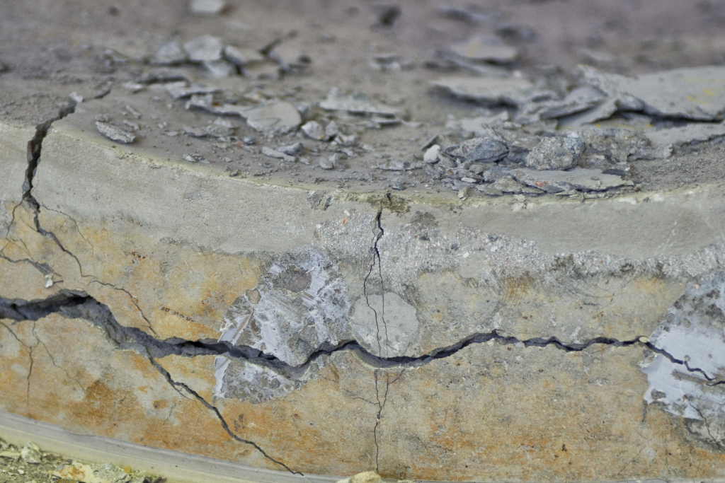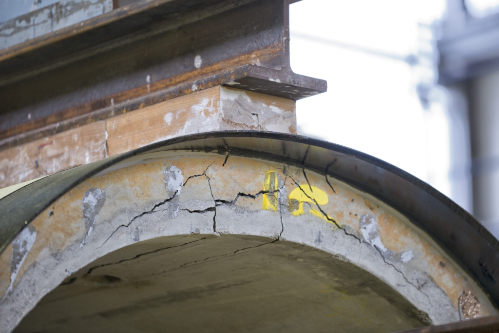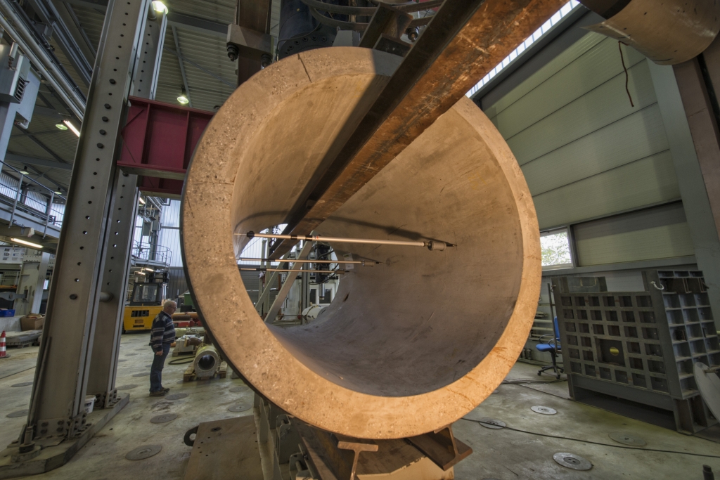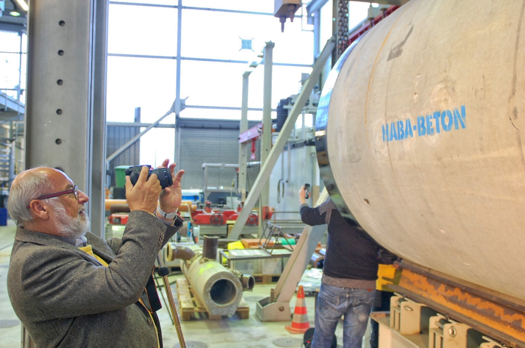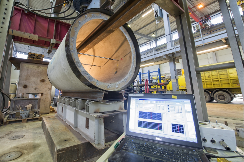 Erst knackt es leise, dann immer lauter. Die ersten Risse zeigen sich. Dann erhöht der mächtige 4.000-kN-Zylinder den Druck auf das große Stahlbetonrohr. Betonbrocken prasseln auf den Hallenboden. Zum Schluss gibt des ganze Rohr nach. Tiefe Risse klaffen im Beton.
