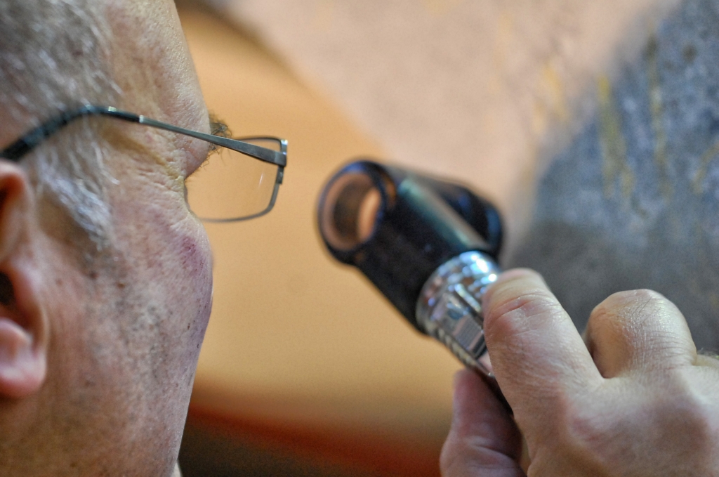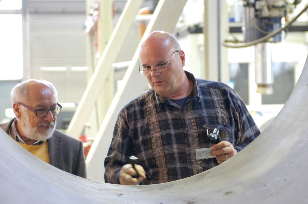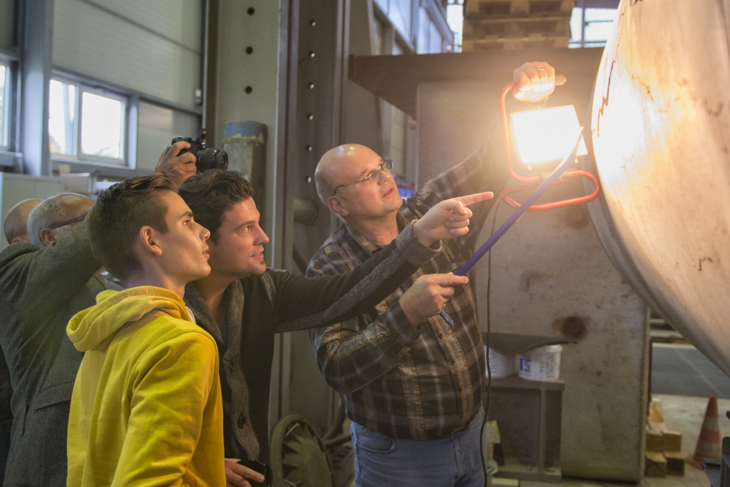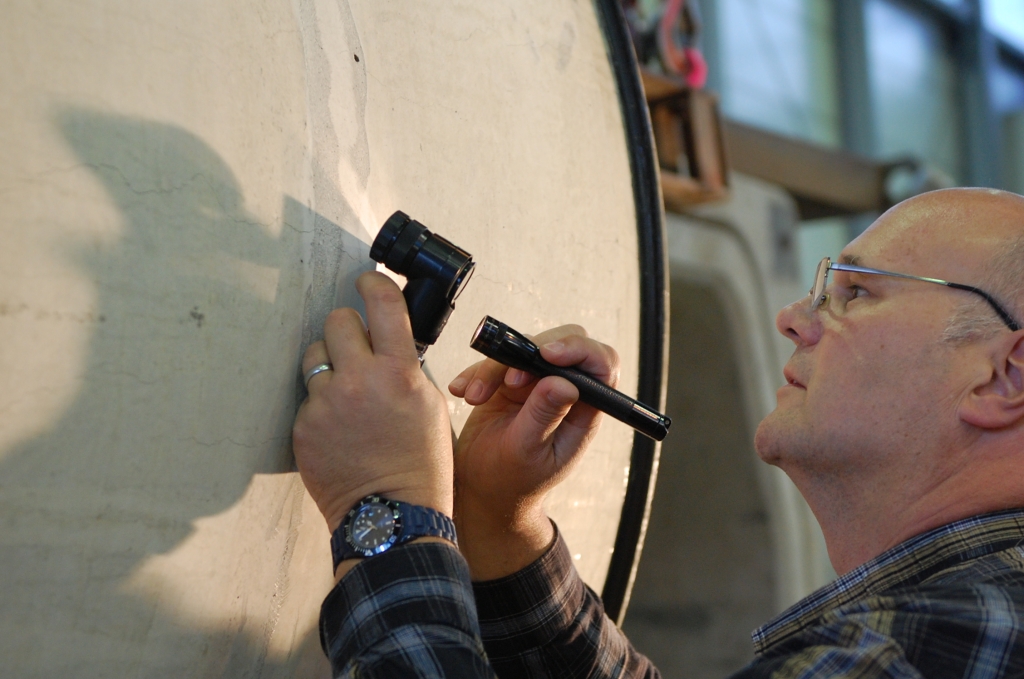 Risse an der Außenseite, IKT-Wissenschaftler hält Lampe, Auftraggeber macht Foto