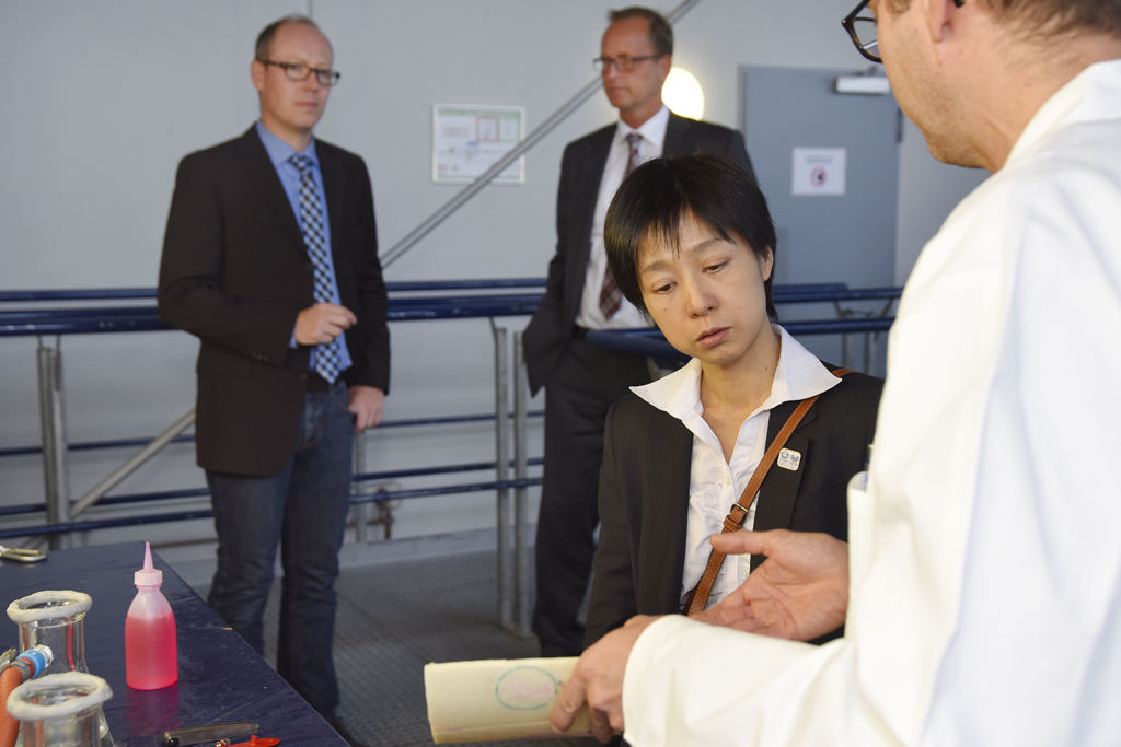 Stefan Kötters, stellvertretender Prüfstellenleiter, erläutert Yoko Horiguchi vom Tokioter Abwasserbetrieb die Arbeit der IKT-Prüfstelle.