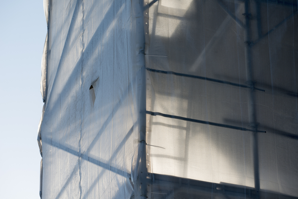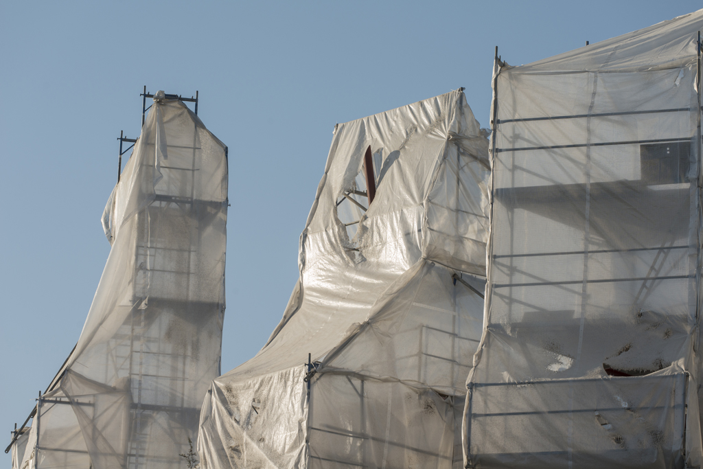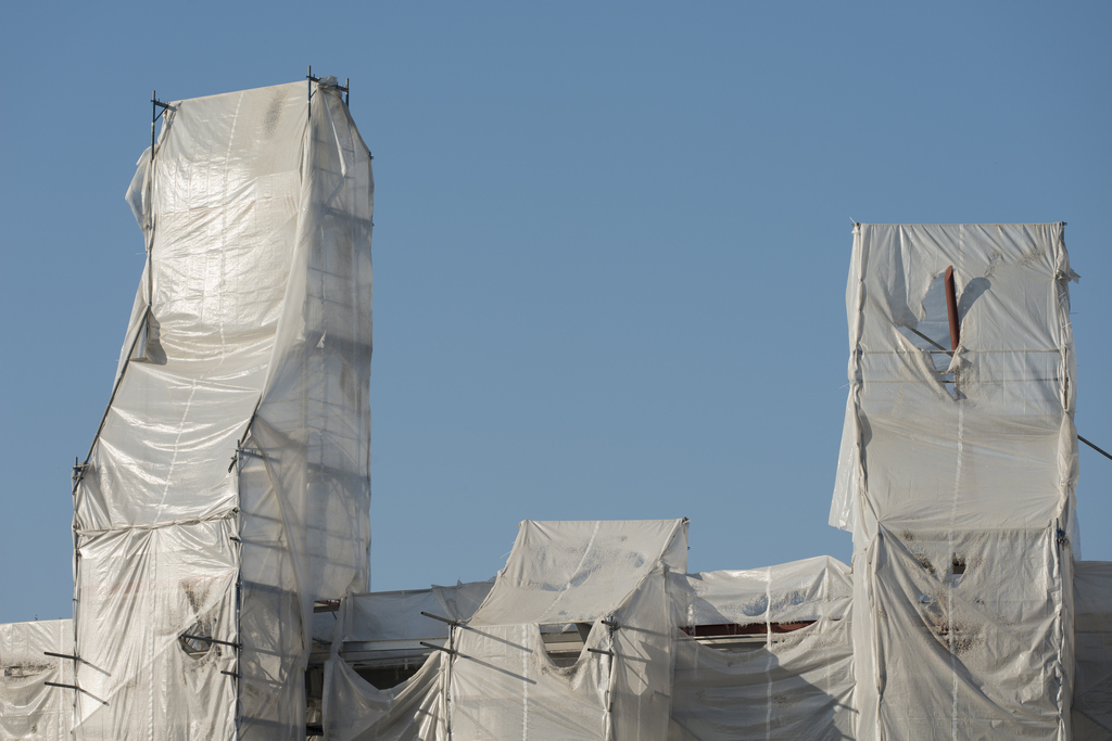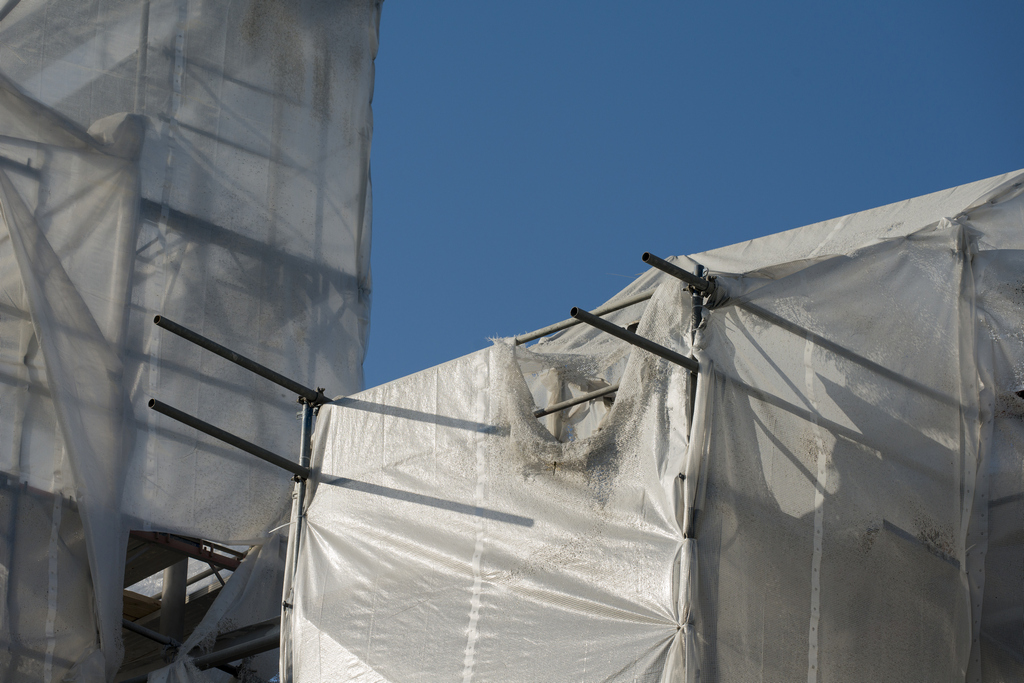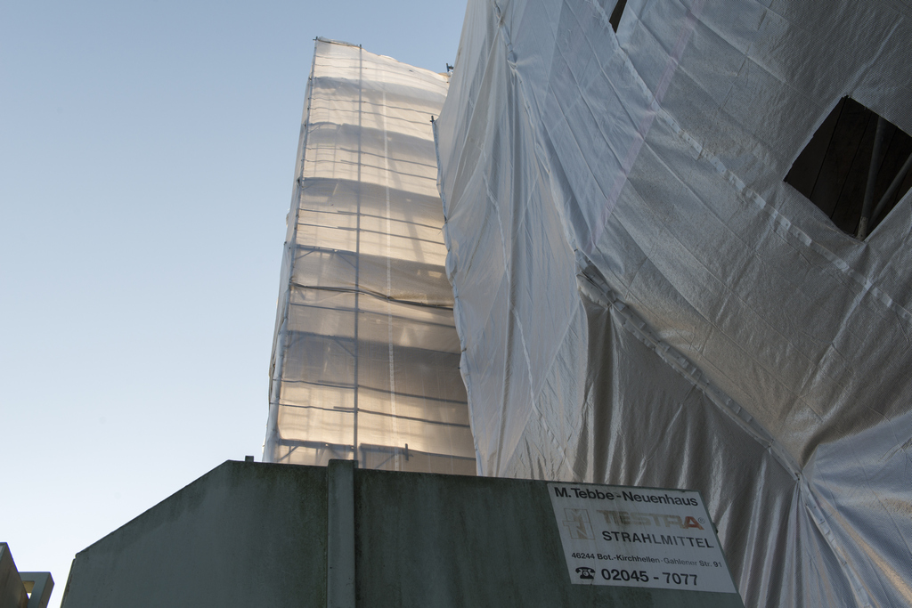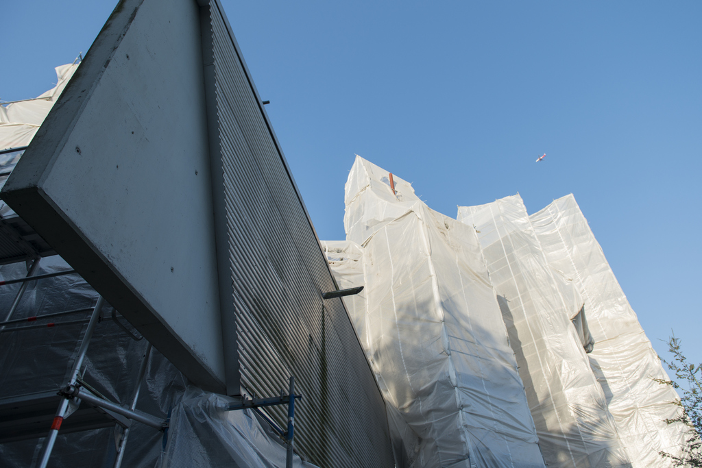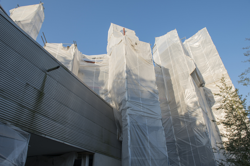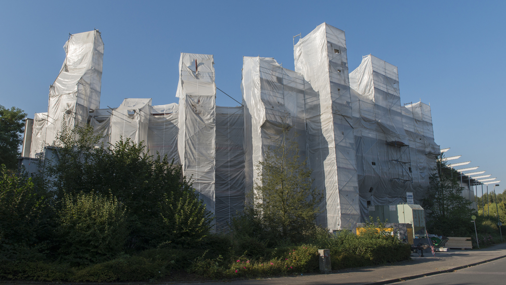 Die Sichtbetonflächen werden gestrichen. Und die Metallteile der Fassade bekommen neue Feuer- und Rostschutzfarbe. Wegen der dafür notwendigen Sandstrahlarbeiten ist ein aufwändiges Gerüst mitsamt Einhausung aus weißem Kunststoffgewebe hochgezogen worden. Und so präsentiert sich das IKT in strahlendem Weiß als ob es ein Kunstwerk wäre.