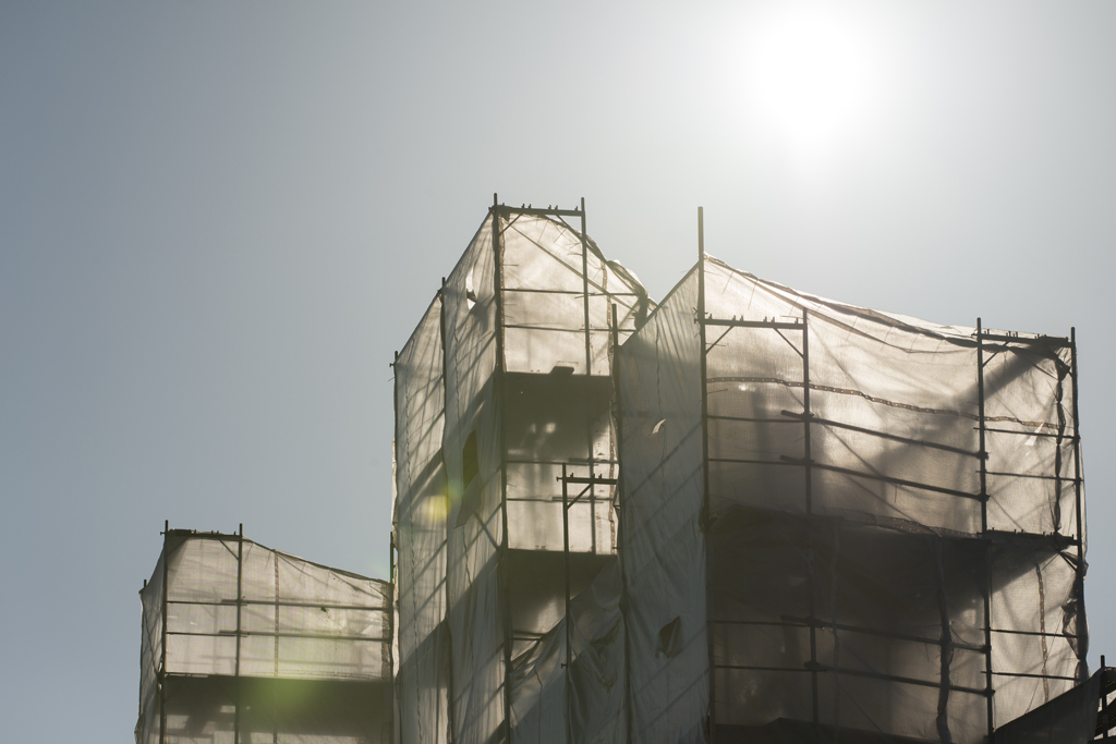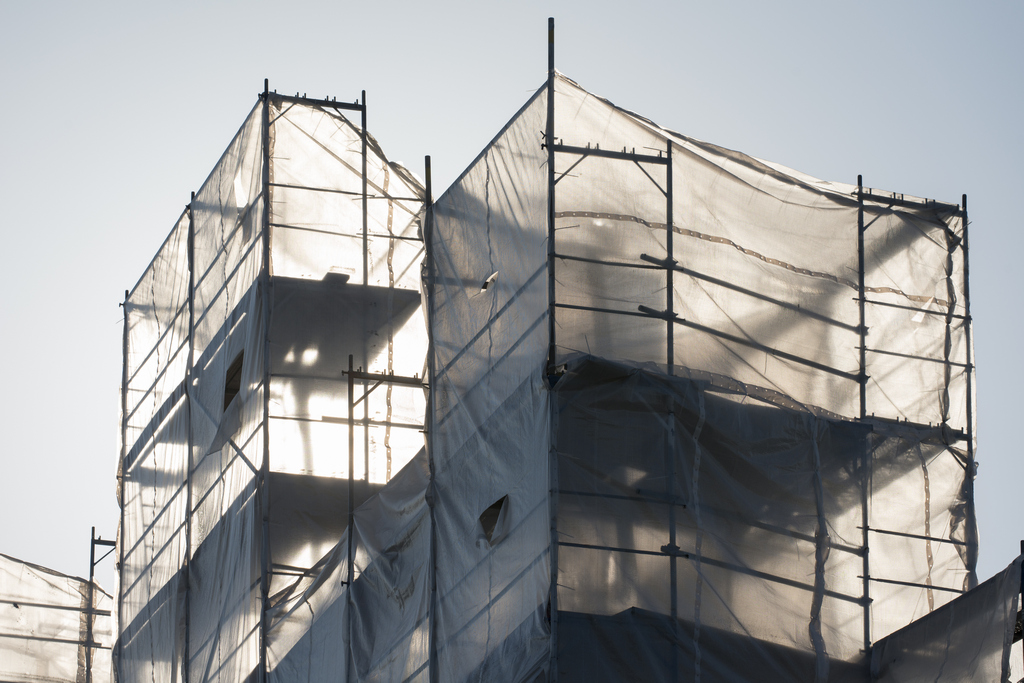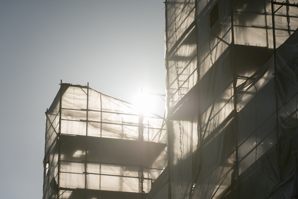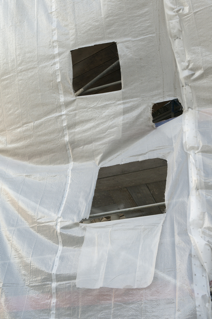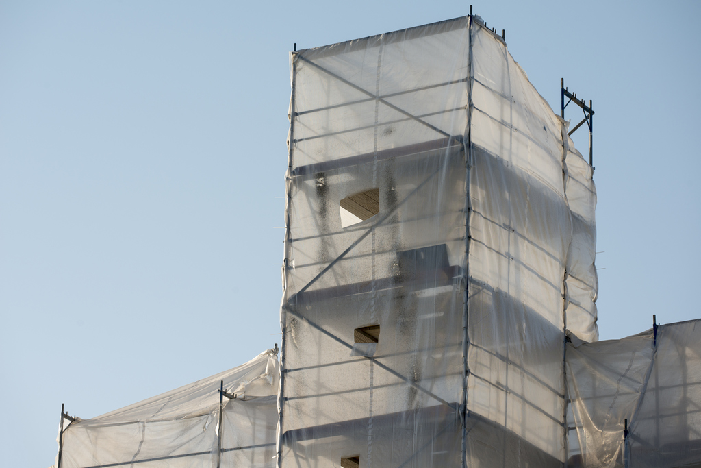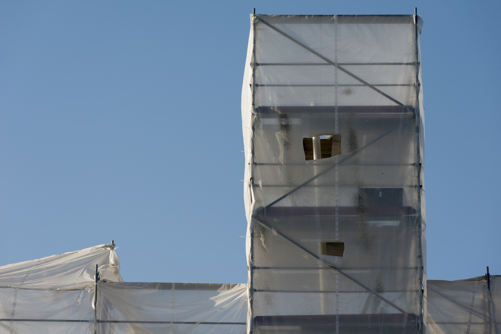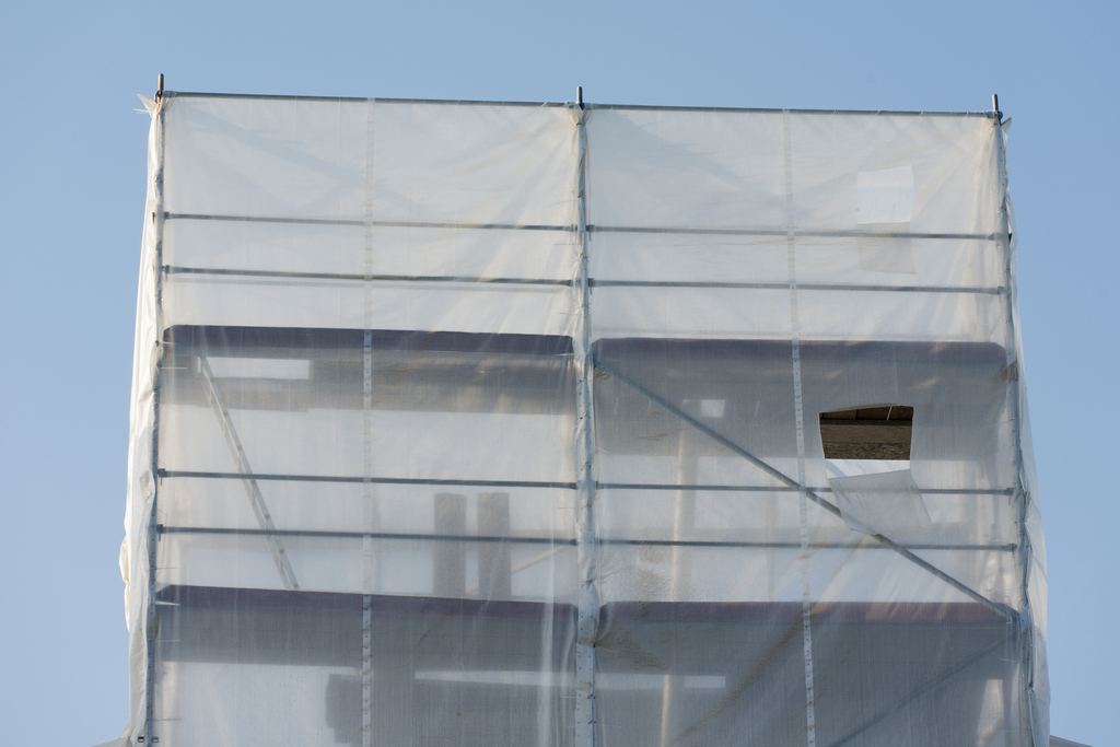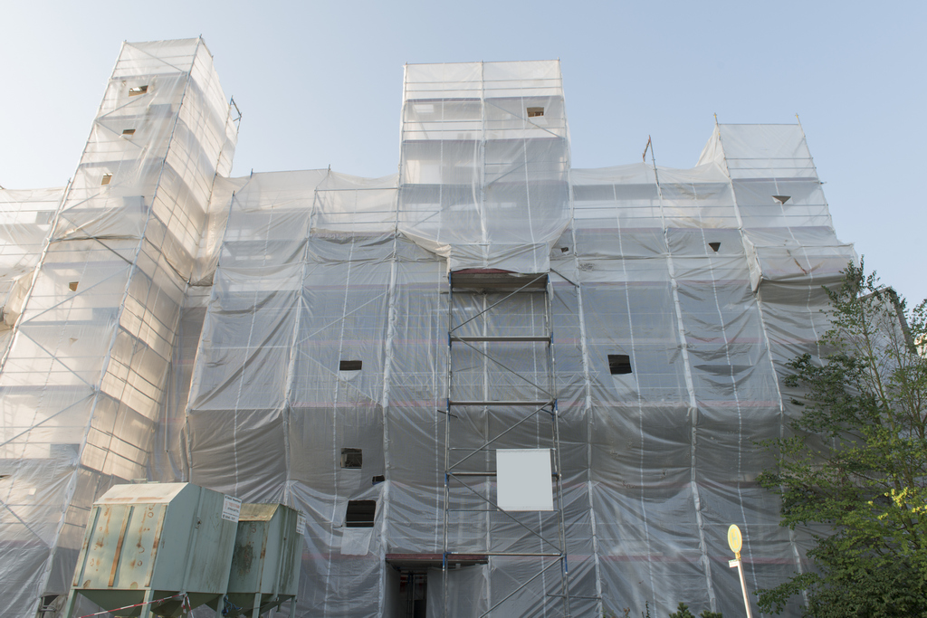 Die Sichtbetonflächen werden gestrichen. Und die Metallteile der Fassade bekommen neue Feuer- und Rostschutzfarbe. Wegen der dafür notwendigen Sandstrahlarbeiten ist ein aufwändiges Gerüst mitsamt Einhausung aus weißem Kunststoffgewebe hochgezogen worden. Und so präsentiert sich das IKT in strahlendem Weiß als ob es ein Kunstwerk wäre.