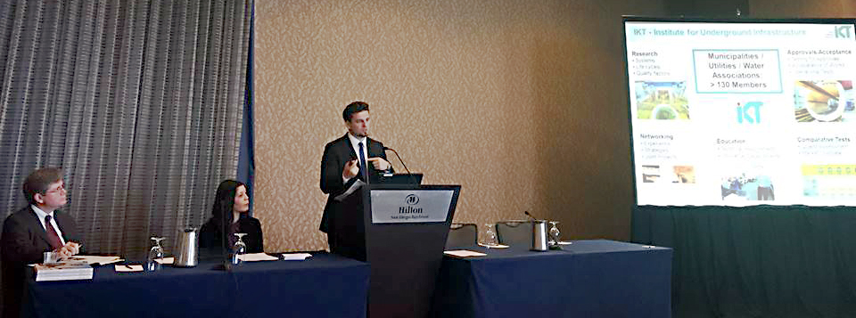 Dieses Weiterbildungsangebot stieß bei den Konferenzteilnehmern auf großes Interesse. Das absolute Highlight des Vortragsblocks war allerdings die Live-Schaltung zum IKT. Denn während im 9.000 Kilometer entfernten San Diego die Teilnehmer den Tag begrüßten, ließ in Gelsenkirchen am späten Nachmittag Prof. Dr.-Ing. Bert Bosseler, Wissenschaftlicher Leiter des IKT den „3. Deutschen Tag der Kanalreinigung“ mit einem Vortrag über das Verlegen von Breitbandkabeln in Kanälen und anderen Infrastrukturnetzen ausklingen. Dieser Vortrag wurde über das Internet live in den Konferenzsaal in San Diego übertragen und anschließend gemeinsam diskutiert. Die Begeisterung über die verbindende Wirkung dieser neuen technischen Möglichkeiten war an beiden Enden der Leitung zu spüren.Bericht vom 3. Deutschen Tag der Kanalreinigung