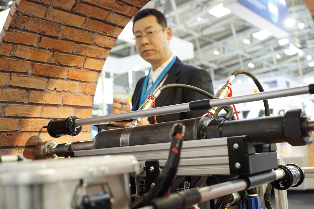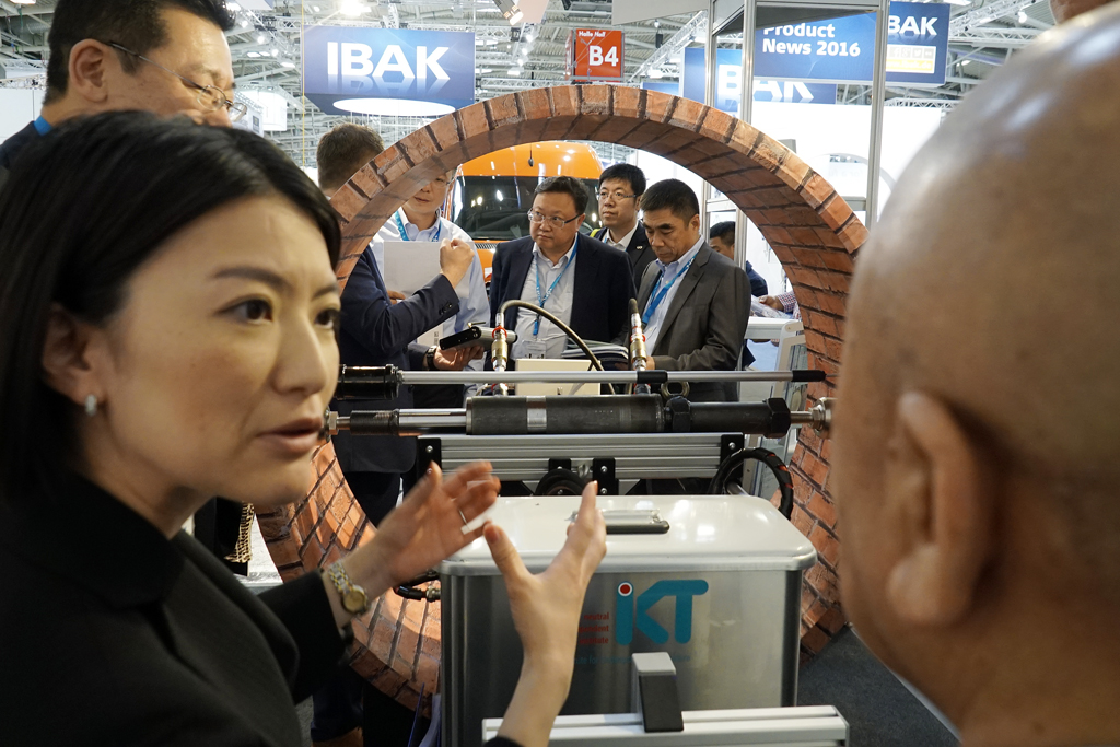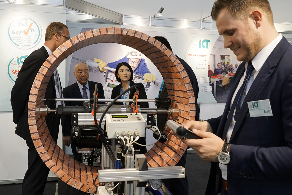 Die IKT-Crew am Stand zeigt das MAC-Gerät im Einsatz: Das vorsichtige Auseinanderdrücken der Rohrwandung im Kämpferbereich führt zu minimalen Verformungen von wenigen Zehntelmillimetern, die von feinen Sensoren gemessen werden. Daraus folgert das System, wie es Rohr und Bettung geht. Das MAC-System ist in Mauerwerks- und Betonkanälen ab DN 1200 einsetzbar. Übrigens auch nach Sanierungs- und Reparaturarbeiten – für einen Vorher-nachher-Vergleich.