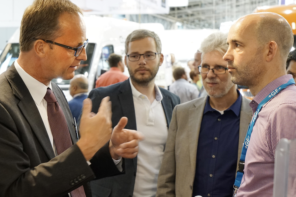 - Prof. Bert Bosseler, Wissenschaftlicher Leiter des IKT, im Gespräch mit Besuchern des IKT-Stands