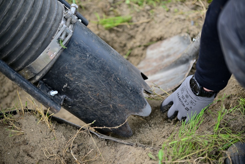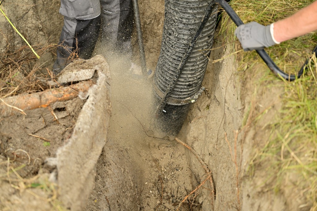 - Saugbagger entfernt vorsichtig Boden um Abwasserleitungen herum ohne Baumwurzeln zu beschädigen