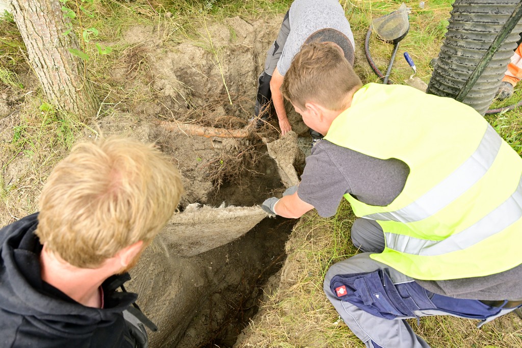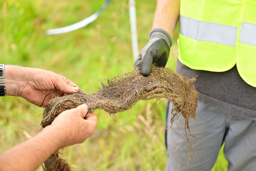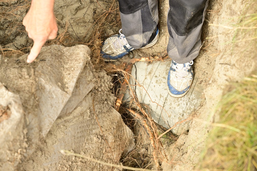 IKT-Forscher ziehen Schutzmatte aus Leitungsgraben heraus, die sie vor sechs Jahren zum Schutz gegen Wurzeleinwuchs eingebaut haben.