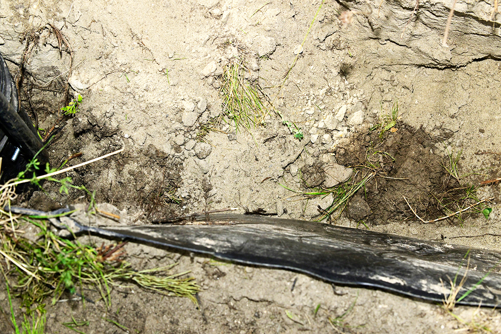 - Blick senkrecht nach unten in den Leitungsgraben: Gut zu sehen ist die schwarze Schutzmatte gegen Wurzeln