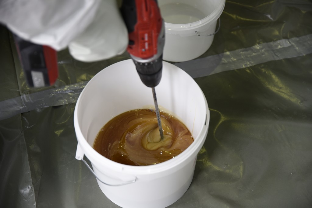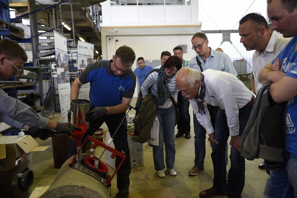 Den Kurzliner Marke MC Bauchemie haben zwei Teilnehmer unter der fachkundigen Anleitung von Christoph Lobeck selbst imprägniert. „Nicht zu viel Harz, aber auch nicht zu vorsichtig dosieren. Und schön gleichmäßig verteilen“, rät er den beiden.In der großen Versuchshalle des IKT zeigte Michael Pfeffer den Einbau der Quick-Lock Innenmanschette. Quick-Lock dichtet und stabilisiert das Schadensbild rein mechanisch.