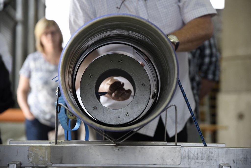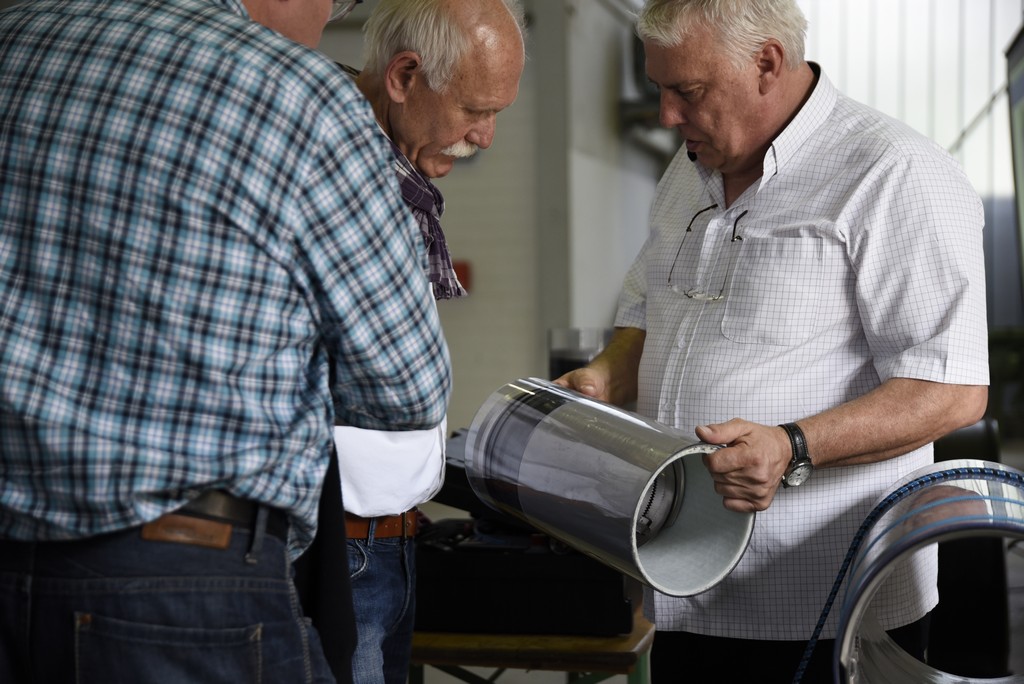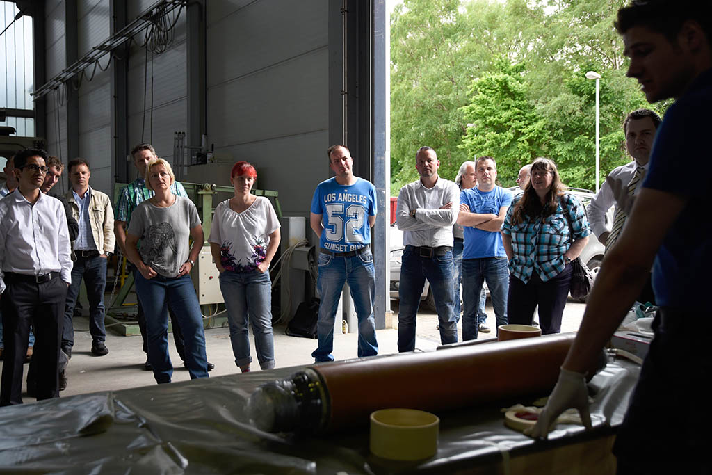 In der IKT-Versuchshalle werden verschiedene Verfahren im Einsatz gezeigt – ganz nah und anschaulich, und nicht tief unten im Kanal. Und dieses Mal haben zwei Teilnehmer sogar selbst angepackt und unter fachkundiger Anleitung einen Kurzliner imprägniert und zusammengelegt.