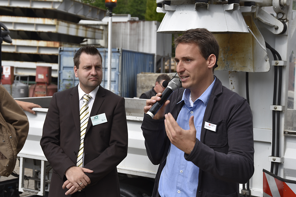 Dipl.-Wirt.-Ing. (FH) Niklas Janssen vom Dienstleister Umwelttechnik Janßen GmbH ergänzte: Manuelle Handreinigung sei heute immer noch gängige Praxis. Dabei sind die vollen und nassen Eimer viel zu schwer – Vorgaben der Berufsgenossenschaft verbieten das Heben. Die Schwierigkeit für Dienstleister: Unterschiedlichste Rost- und Eimermodelle müssen gereinigt werden, und oft weiß der Auftraggeber selbst nicht, welche Typen im Stadtgebiet verbaut sind. Anschließend wurden die Fahrzeuge von EUV und Janßen auf dem IKT-Gelände in Aktion gezeigt.