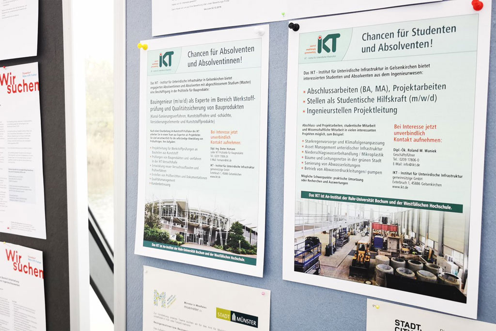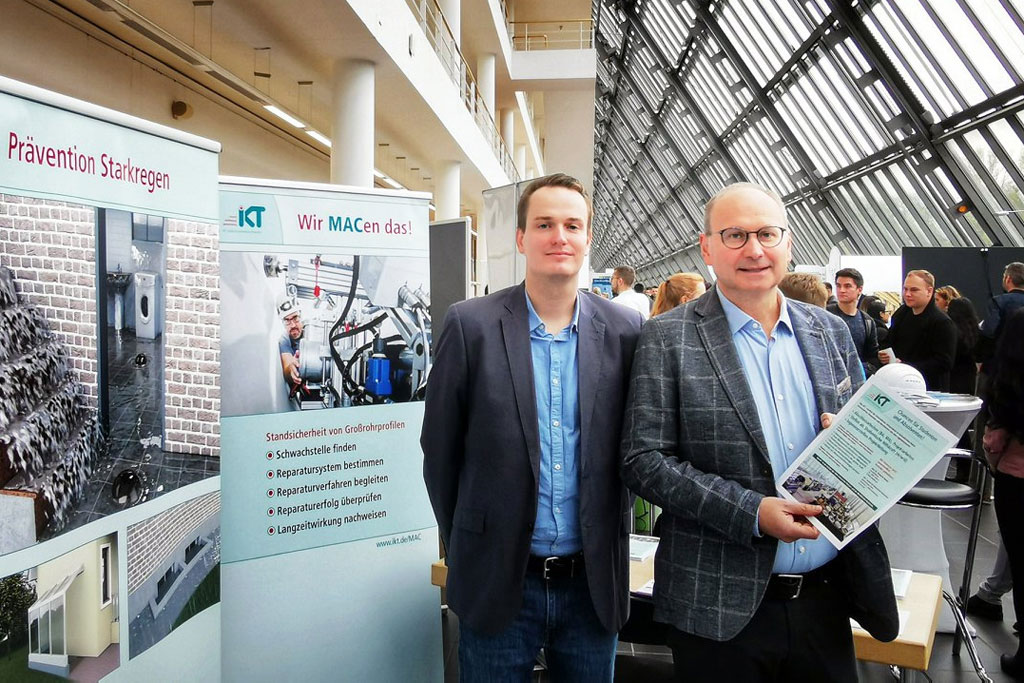 Das IKT hat auf dem Karrieretag Öffentliche Bauverwaltung in Gelsenkirchen den rund 200 Student/-innen und Absolvent/-innen von Bau-Studiengängen die Chancen vorgestellt, die das Institut jungen Ingenieuren und solchen, die es werden wollen, bietet. So kann man im IKT als Studentische Hilfskraft, Praktikant und Wissen­schaftlicher Mitarbeiter (m/w/d) seine Karriere starten. Das IKT bietet vor allem spannende Aufgaben und selbstständiges Arbeiten an hochaktuellen Themen wie Starkregen, moderne Werkstoffe und Digitalisierung von Bauprozessen.