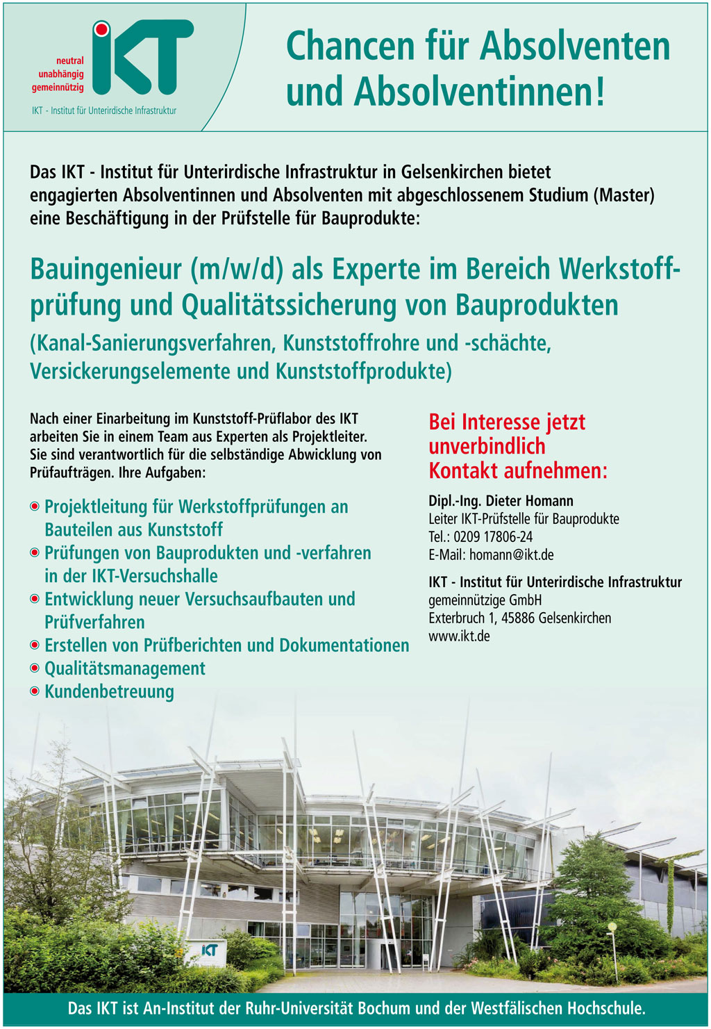 Die IKT-Prüfstelle für Bauprodukte sucht ab sofort eine Bauingenieurin oder einen Bauingenieur als Projektleiter (m/w/d) für den Bereich Werkstoffprüfung und Qualitätssicherung. Auf eine gründliche Einarbeitung im Kunststoff-Prüflabor folgt die selbstständige Abwicklung von Prüfaufträgen. Später geht es dann auch um die Entwicklung neuer Versuchsaufbauten und Prüfverfahren. „Bei uns in der Prüfstelle findet man ein vielseitiges, herausforderndes Arbeitsfeld“, verspricht Dieter Homann, Leiter der Prüfstelle.