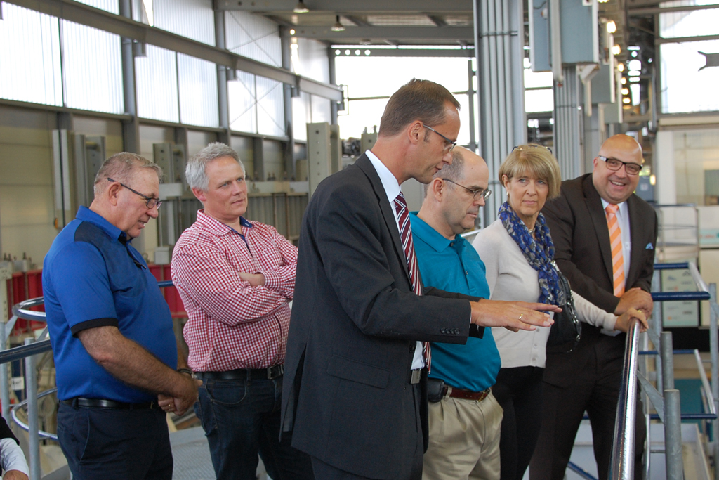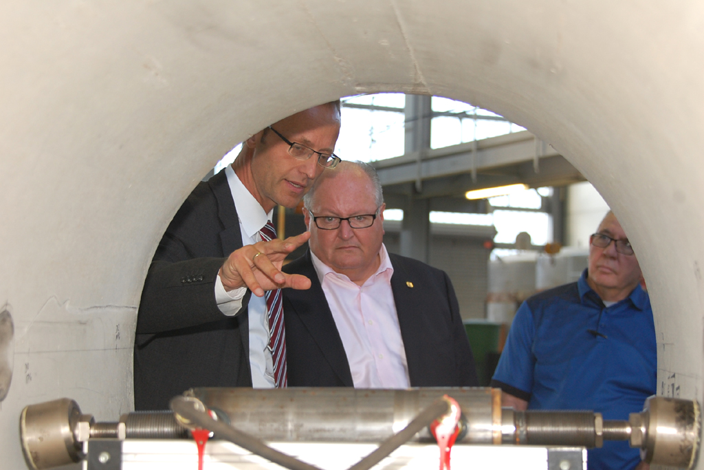 - Prof. Dr.-Ing. Bert Bosseler zeigt den Gästen aus Amerika den Großversuchsstand