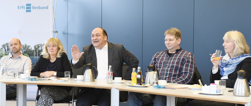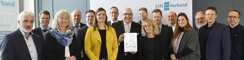 Forschungsbericht abgestimmt (v.l.n.r.): Prof. Heinrich Schäfer (Erftverband), Andrea Kaste (NRW-Umweltministerium), Roland W. Waniek (IKT), Martina Brehm (Landesumweltamt), Markus Gillar (IKT), Horst Baxpehler (Erftverband), Stefan Görgens (Bezirksregierung Düsseldorf)