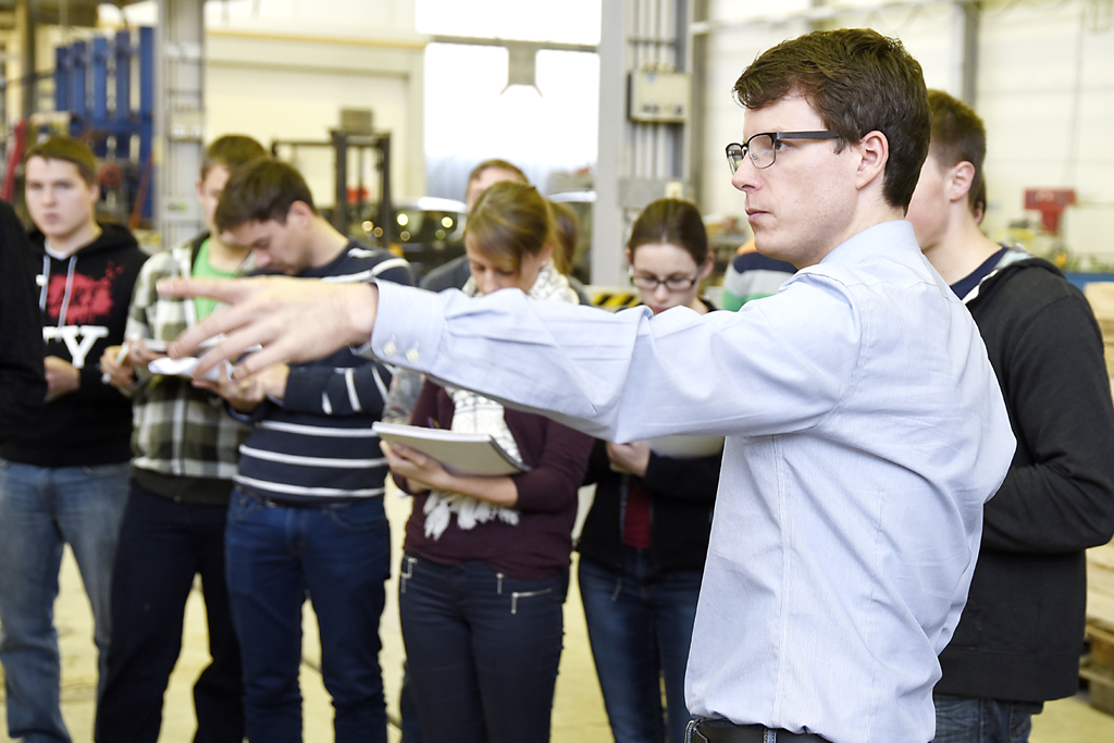 - Marcel Goerke, M.Sc. zeigt den Studenten die Prüfeinrichtungen in der IKT-Versuchshalle.