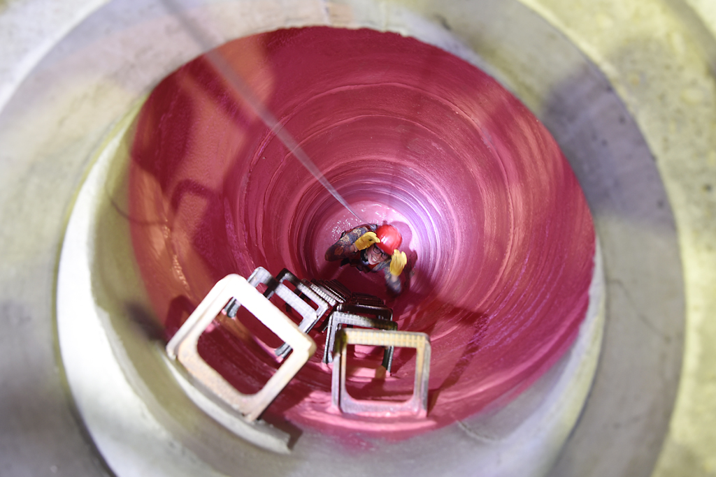 Den Dingen auf den Grund gehen – das lernt man im Studium. Und im IKT konnten die Studenten ganz praktisch auf den Grund eines Schachts gehen. IKT-Wissenschaftler Dipl.-Ing. Markus Gillar übte mit den Studenten den Einstieg in Schächte. Derzeit sind im Großversuchsstand 15 gezielt beschädigte Schächte verbaut, die im Rahmen des IKT-Warentests „Schachtsanierung“ mit verschiedenen Systemen repariert werden.