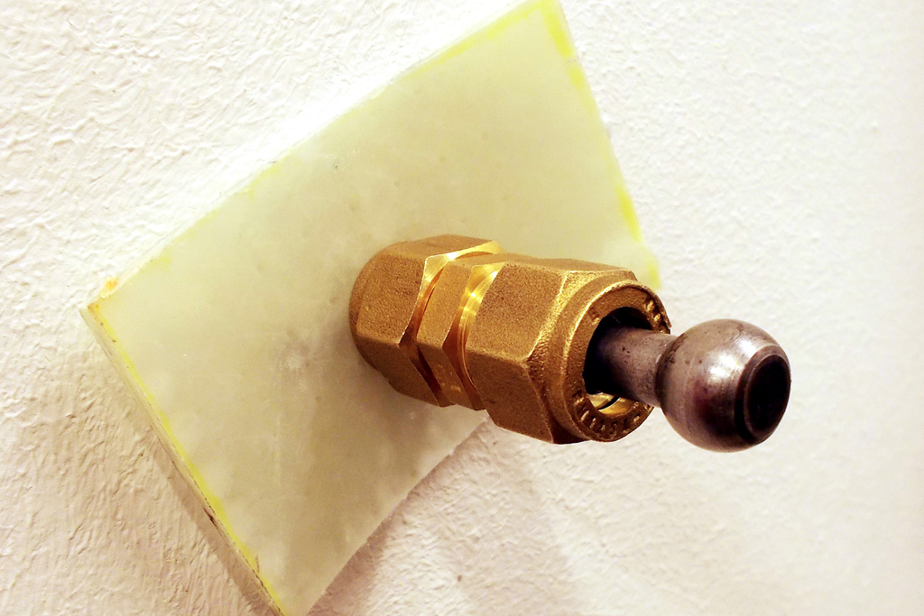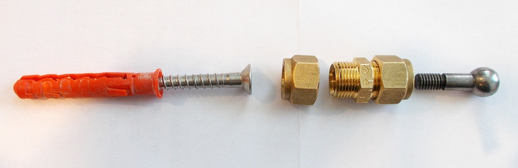 - Drei Teile aus dem Baumarkt: In die Mutter kann der Kugelbolzen eingeschraubt werden.