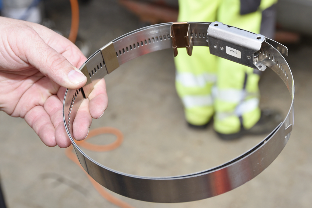 Gemeinsam mit der FAST Opticom AG, die auf die Verlegung von Breitbandkabeln in Abwasserkanälen spezialisiert ist, wurde auf dem IKT-Gelände eine Teststrecke gebaut, die die Lenninger Fallleitung nachbildet.Der Einbau des Breitbandkabels erfolgt mithilfe eines Roboters, der mit einem Briedensetzmodul und einem Magazinwagen mit 10 zu setzenden Brieden ausgestattet ist. Die aus V4A-Stahl hergestellten Brieden sind speziell zur Fixierung der FAST-Leerrohre entwickelt worden. Die Leerrohre nehmen später das Glasfaserkabel auf. Den ganzen Tag wurde gearbeitet, nachjustiert, gemessen und protokolliert. Schließlich soll das System noch im Zuge einer Hochdruckreinigung getestet werden.