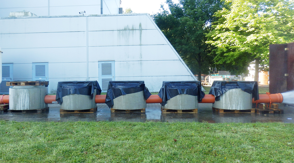 Auf dem IKT-Gelände haben die Prüfer fünf Schachtunterteile mit PVC-Rohren zu einer zehn Meter langen Teststrecke verbunden. Sie haben insgesamt 60 Reinigungszyklen ohne Stillstand der Düse durchgeführt. Ein Zyklus besteht dabei jeweils aus dem Einspülen und dem Rückziehen der Düse durch den gesamten Rohrstrang. Dabei verwendeten die Wissenschaftler der IKT-Prüfstelle eine viereinhalb Kilo schwere 8-strahlige Rundumstrahldüse mit einer Länge von etwa 17 Zentimeter und einem Durchmesser von rund 8 Zentimeter verwendet.Keine Schäden nach 60 Reinigungszyklen