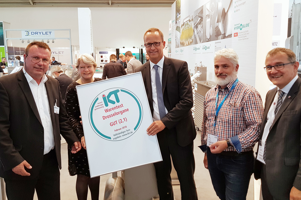 Zur Siegelübergabe am Steinhardt-Stand waren auch Dr. Beatrix Tappeser, Staatssekretärin im hessischen Umweltministerium, Dr. Rainer Waldschmidt, Geschäftsführer von Hessen Trade & Invest, und der Sprecher des Lenkungskreises des IKT-Warentests „Drosselorgane“, Dipl.-Ing. Horst Baxpehler vom Erftverband gekommen.