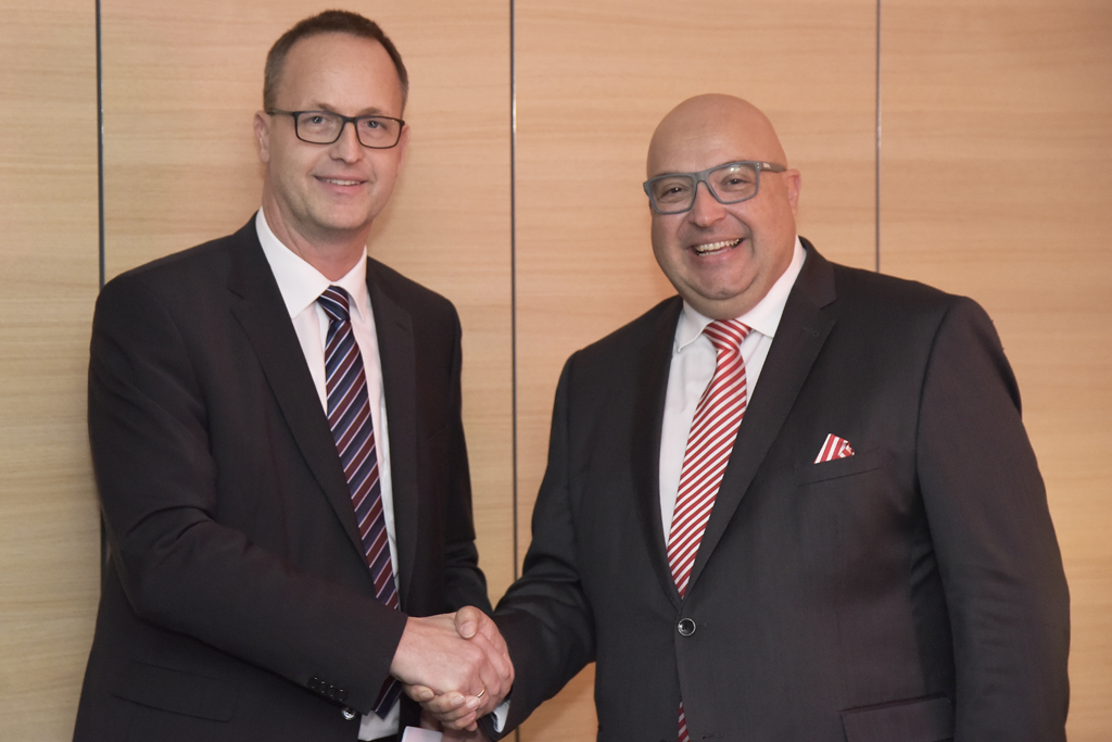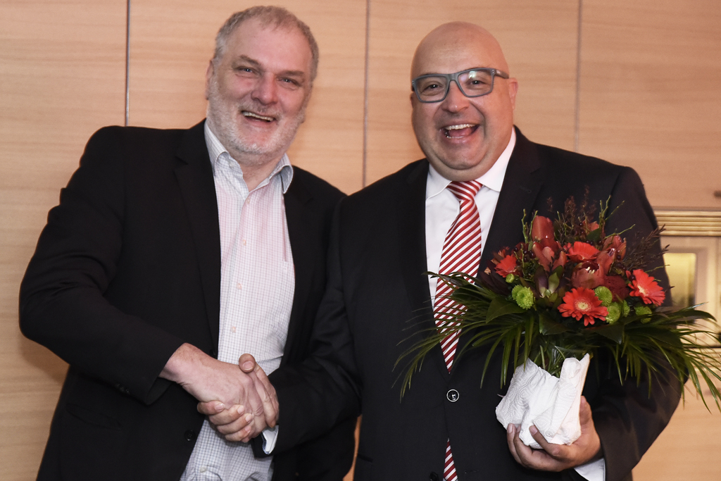 - Prof. Bert Bosseler (l.) bedankt sich für die gute Zusammenarbeit.