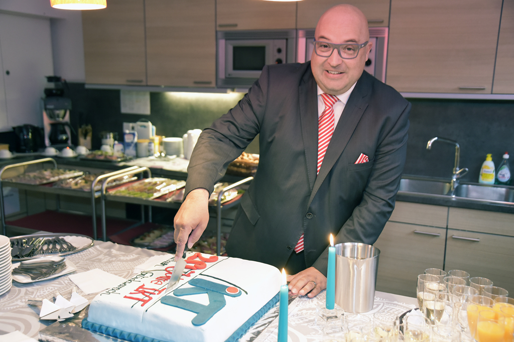 - Mit der Erfahrung aus 20 Dienstjahren: Roland W. Waniek schneidet souverän die Torte an.