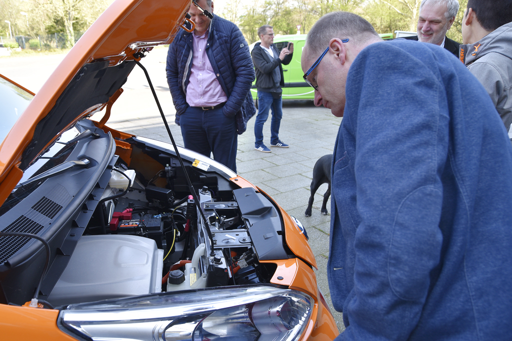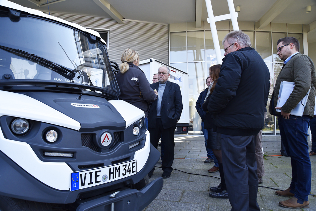Wenn man den halben Tag so viel über Elektromobilität gehört hat, dann will man irgendwann auch mal die entsprechenden Fahrzeuge sehen. Vor dem Institutsgebäude hatten die Teilnehmerinnen und Teilnehmer schließlich die Gelegenheit, verschiedene Fahrzeuge für den kommunalen Einsatz in Augenschein zu nehmen und Probe zu sitzen.Dort stand der StreetScooter, der sich schon als gelber Transporter der Post im Straßenbild etabliert hat. Mit seinem variablen Aufbaukonzept bietet er sich aber auch für den Einsatz in kommunalen Betrieben an. Der StreetScooter ist extra für die Präsentation des Flottenmanagementsystems der GreenGate AG angereist. Das Flottenmanagementsystem unterstützt bei der Routenplanung durch Verbrauchsberechnung der E-Fahrzeuge, Standorthinweisen von Stromtanken und Staumeldungen. Der ebenfalls in zahlreichen Aufbauvarianten lieferbare ATX von Alkè erledigt typische Arbeiten in kommunalen Betrieben wie Grünflächenpflege, Abfallentsorgung oder Winterdienst. Und das geräuschlos. Es wirkt zwar auf den ersten Blick als gehöre er eher auf den Golfplatz als auf die Straße, die Teilnehmer konnten sich aber überzeugen, dass es sich um ein vollwertiges Fahrzeug mit Straßenzulassung und bis zu 150 km Reichweite handelt. Mitgebracht haben den sportlichen Italiener die Heinrich Moerschen GmbH & Co. KG aus Tönisvorst.