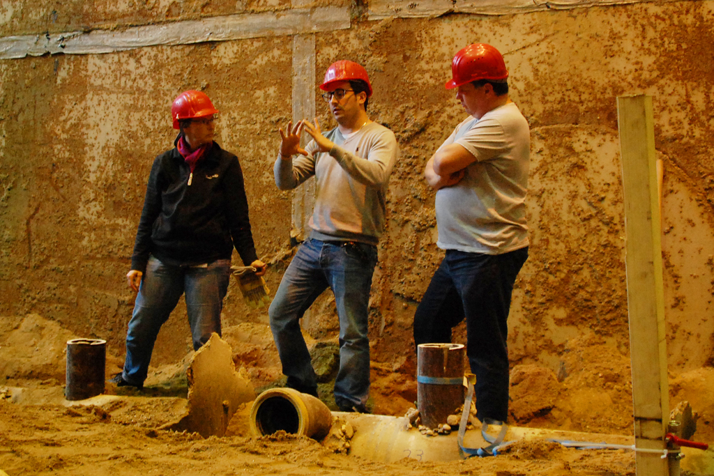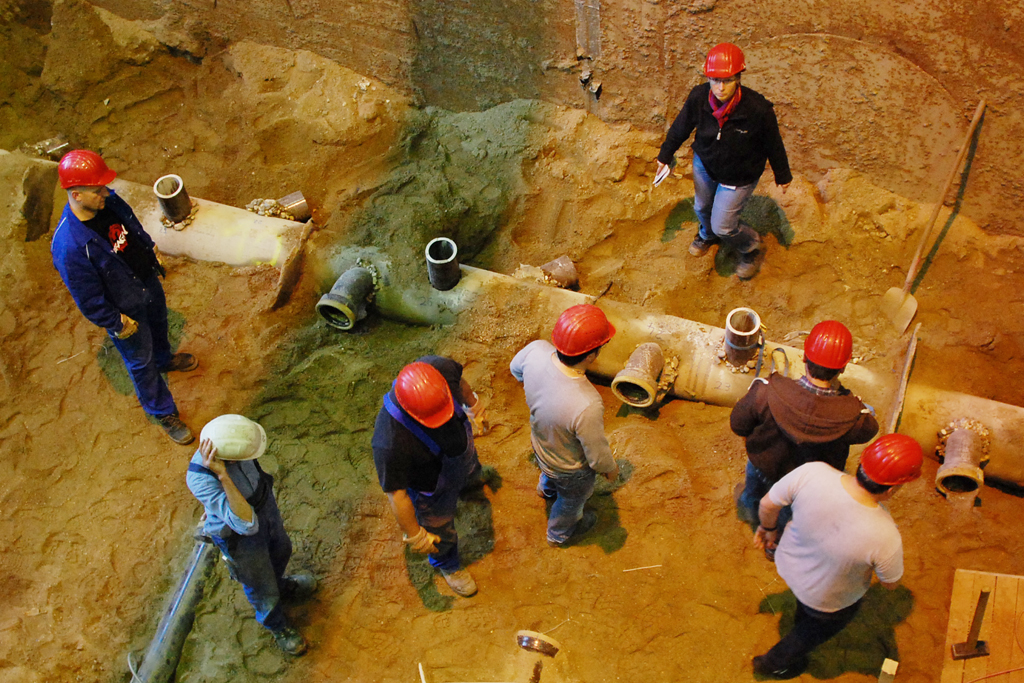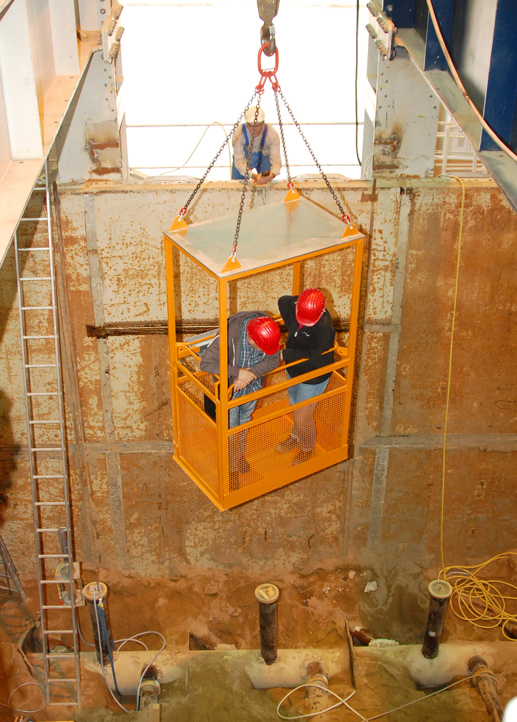Mitglieder des Lenkungskreises schweben im Korb hinab auf den Grund des IKT-Großversuchsstands. Dort nehmen sie die ausgegrabenen Anschlüsse unter die Lupe, die im Rahmen des IKT-Warentest „Reparaturverfahren für Anschlussstutzen“ saniert wurden, und verschaffen sich einen Überblick über die Sanierungsergebnisse.