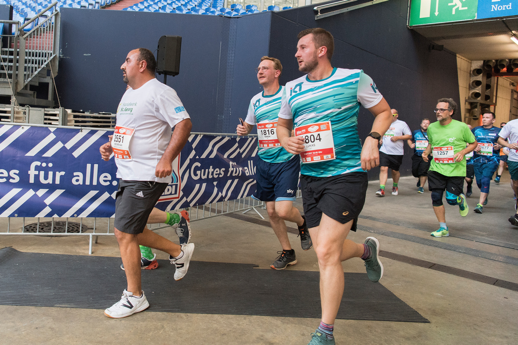 Mitten auf dem Platz, wo sonst die großen Fußballprofis kicken. Zusammen mit allen Teams, allen Läufern und allen Supportern.