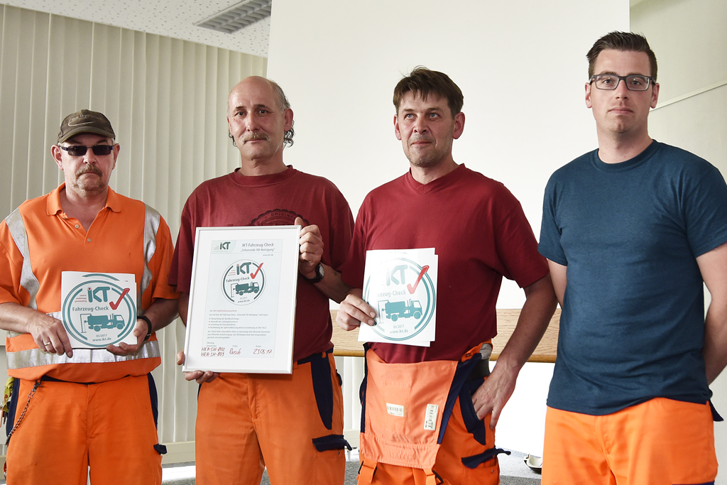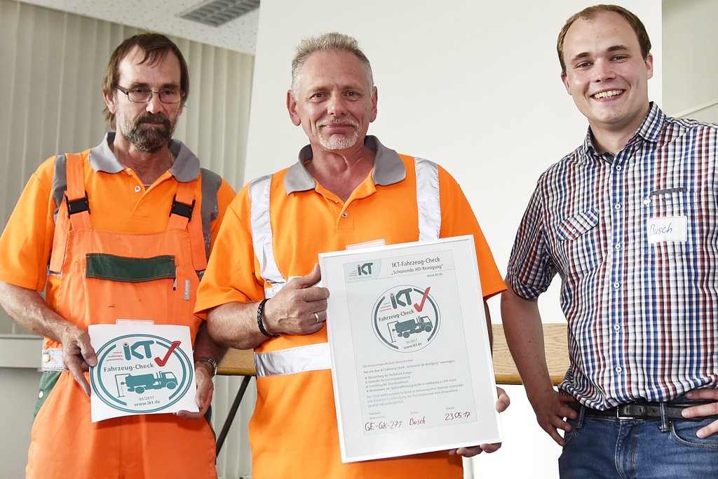 mehr über den IKT-Fahrzeug-CheckDie Fahrzeuge wurden an diesem Tag auf Herz und Nieren – eher auf Pumpe und Düse – getestet. Aber auch die Mitarbeiter spielten eine Rolle. Sie lernten ihre Fahrzeuge besser kennen, ließen sich für die Feinheiten bei der Kanalreinigung sensibilisieren. Besonders für das Betriebspersonal ist die Kenntnis des eingesetzten Drucks von großer Bedeutung. Denn die Fahrzeuge sind sehr stark. Manchmal zu stark, und dann leidet der Kanal. Außerdem nutzten die Teilnehmer den Tag zum intensiven Erfahrungsaustausch mit den Kollegen aus den anderen Kommunen.