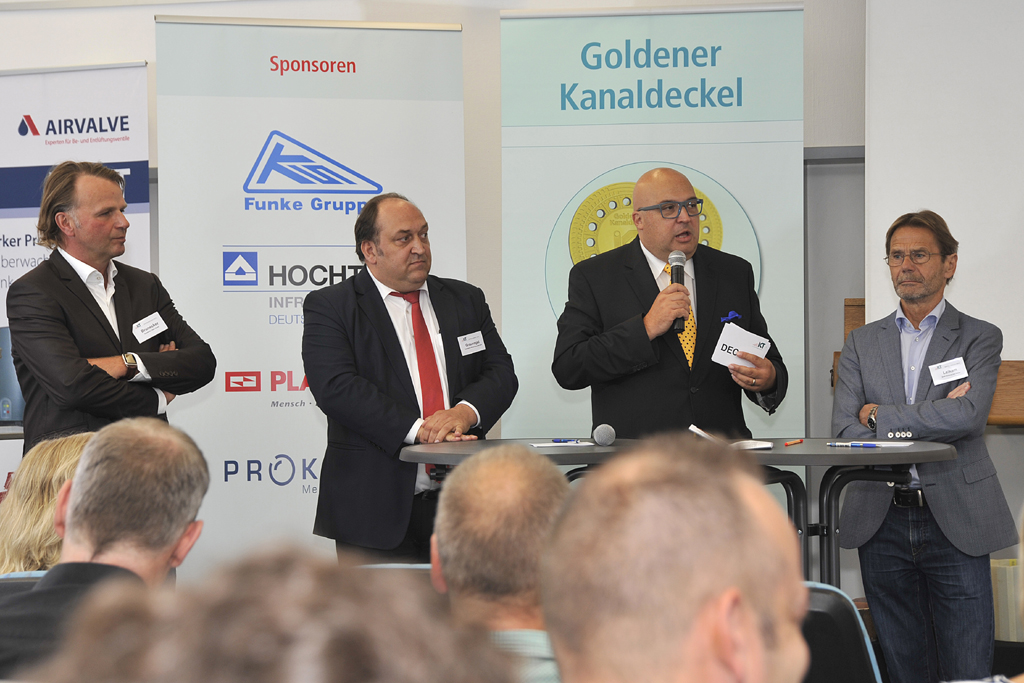 - Goldener Kanaldeckel 2017 (v.l.n.r.): IKT-Geschäftsführer Roland W. Waniek, Alex Braun und Daniela Fiege (3. Preis), Arjo Hof (1. Preis), Jörg Michutta (2. Preis), Laudator Gerhard Odenkirchen (NRW-Umweltministerium)