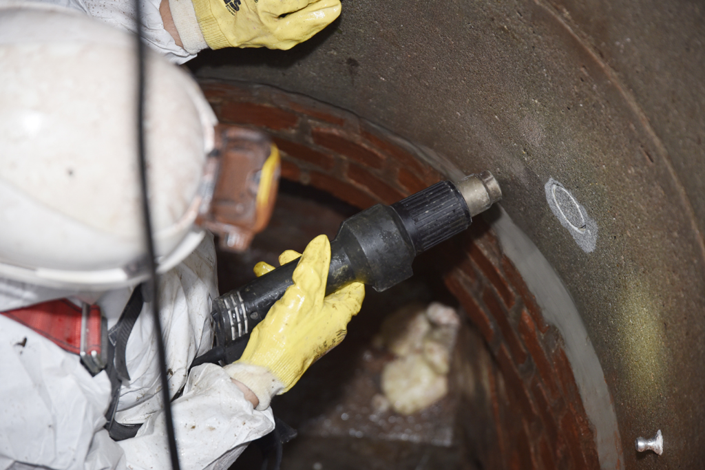 Jetzt nach den Prüfungen der Schachtwand rückt der Reiniger an. Anschließend kann das Sanierungsunternehmen mit der Beschichtung beginnen. In zwei Tagen sind dann die IKT-Prüfer wieder vor Ort und machen Tests an der Beschichtung. Für die DIBt-Zulassung muss geprüft werden, wie stark die Harzschicht an der Schachtoberfläche haftet. Dann stehen wieder Haftzugprüfungen auf dem Plan.