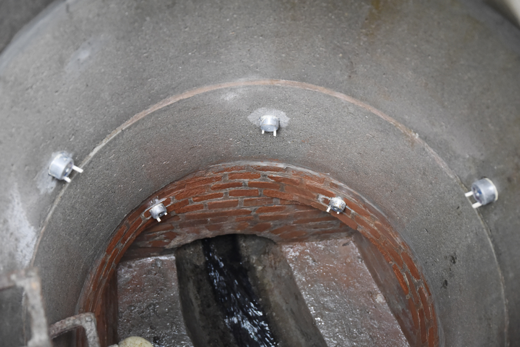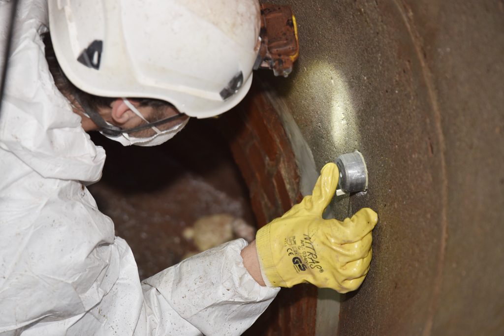 IKT-Projektleiter Dipl.-Ing. Markus Gillar legt gemeinsam mit IKT-Prüfer Marco Bartel die Prüfpunkte sowohl im Mauerwerksteil wie im Betonteil des Schachts fest. Bartel bohrt dann an diesen Stellen runde Nuten in die Schachtoberfläche. Mit Drahtbürste und Wasser reinigt er die Prüfflächen vom Staub. Anschließend trocknet er mit einer Heißluftpistole die Prüfflächen in der durchfeuchteten Schachtwandung, bevor er die Prüfstempel aus Aluminium mit Spezialkleber auf die Flächen klebt.