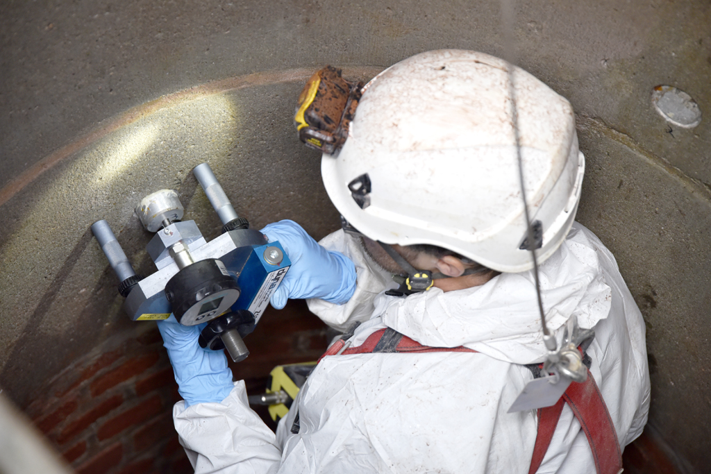 Sanierungsbedürftig: Das IKT prüft die Schachtoberfläche vor der Beschichtung.