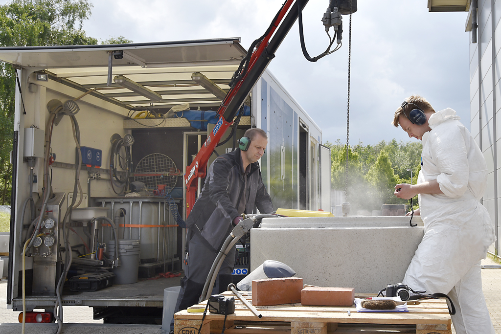 In mehreren Testreihen werden genormte Probenkörper aus Beton und Mauerwerksklinker mit Wasserhochdruck behandelt – unterschiedlich lange, aus unterschiedlichen Abständen sowie mit und ohne Zugabe von Granulat. Anschließend wird jeweils der Materialabtrag gemessen.