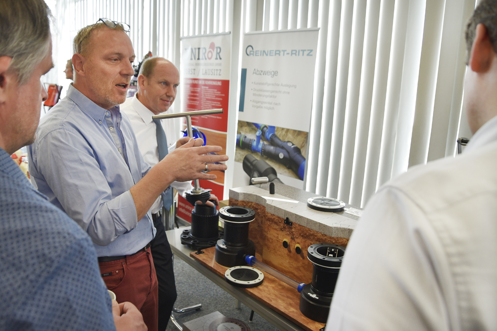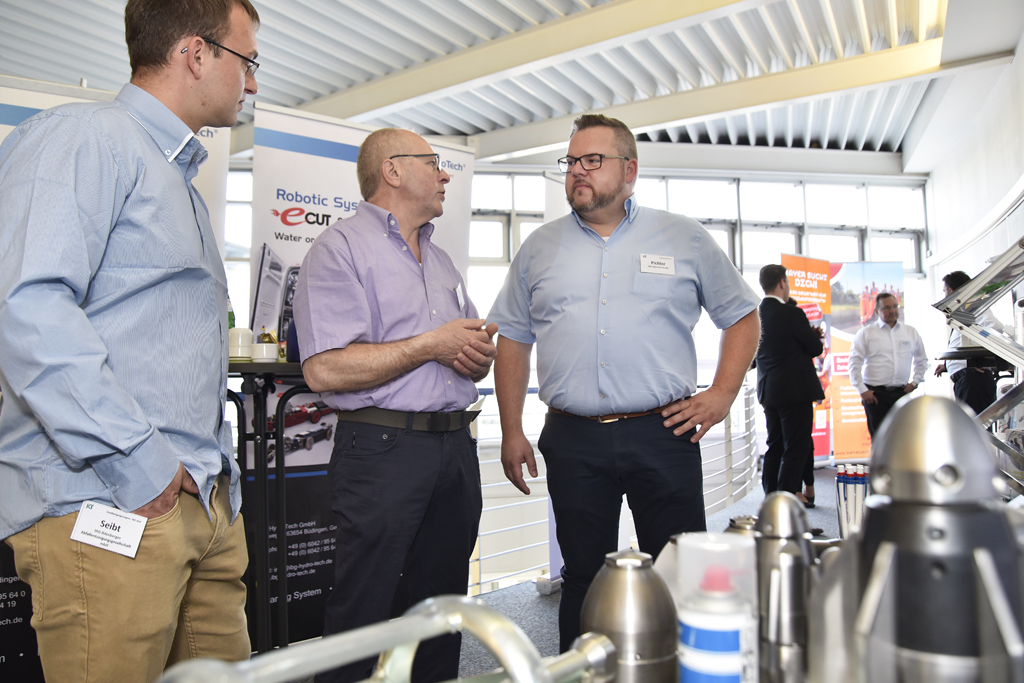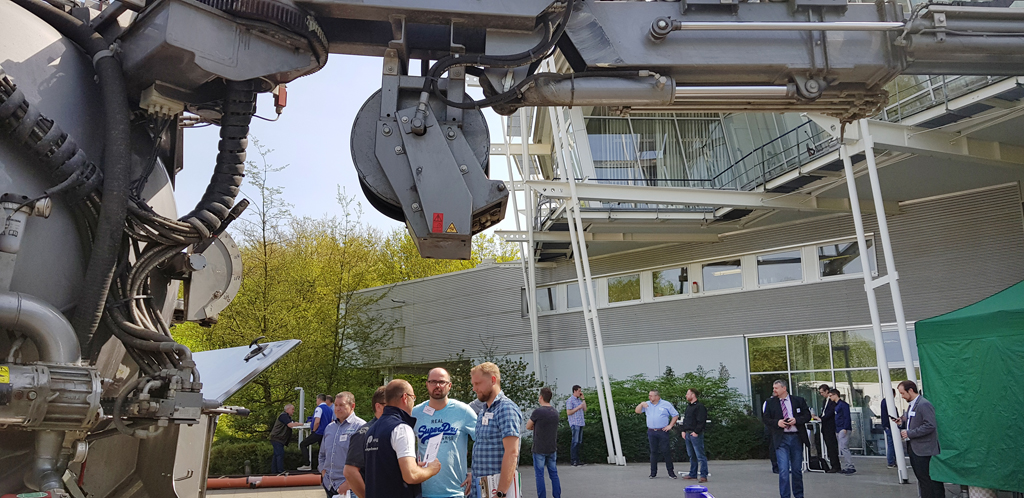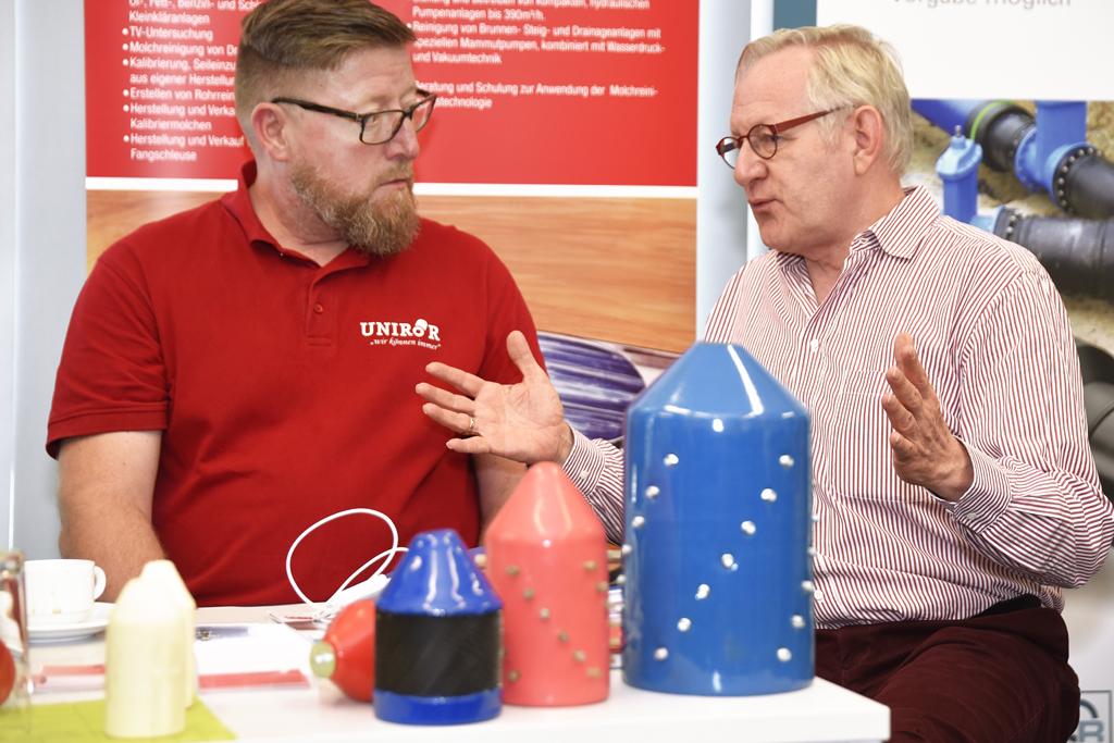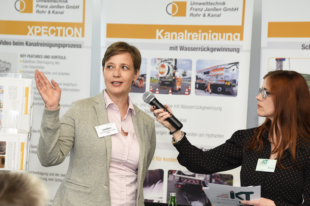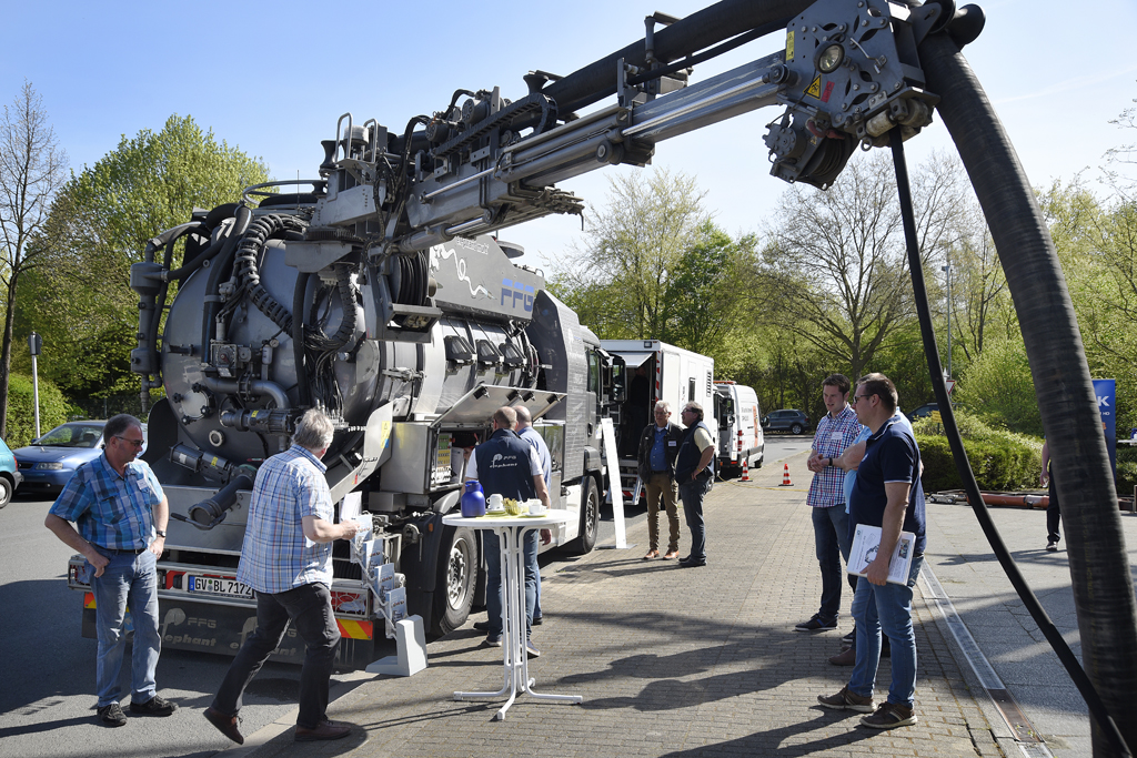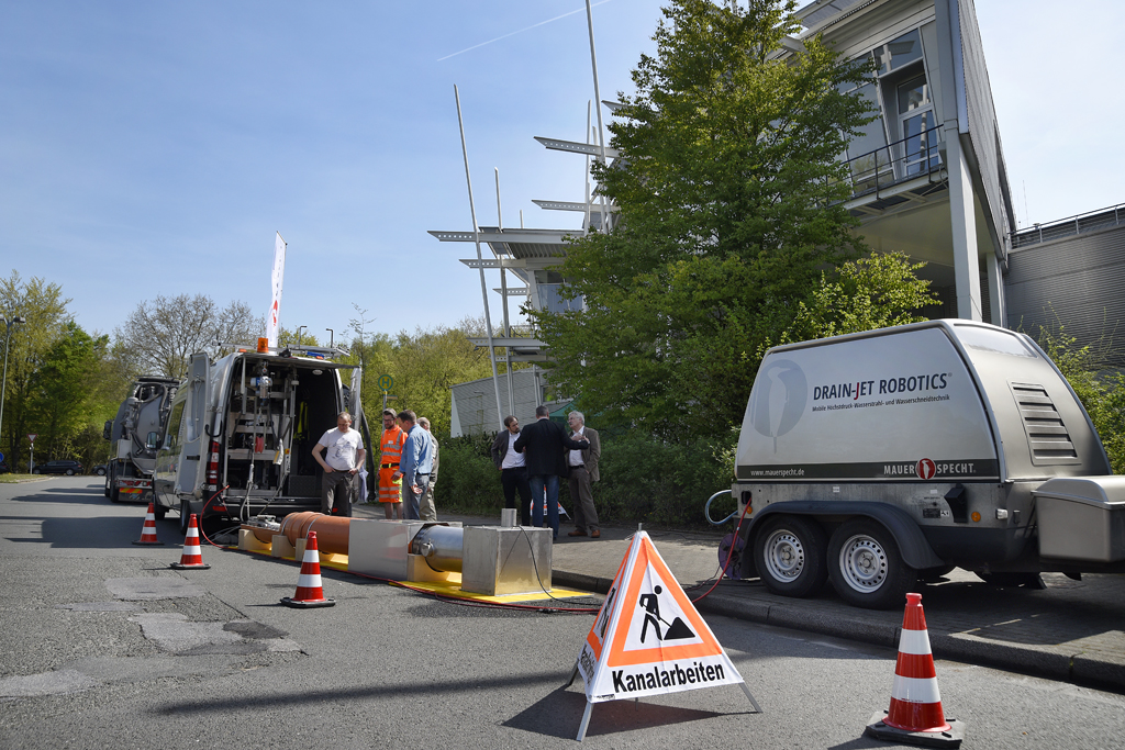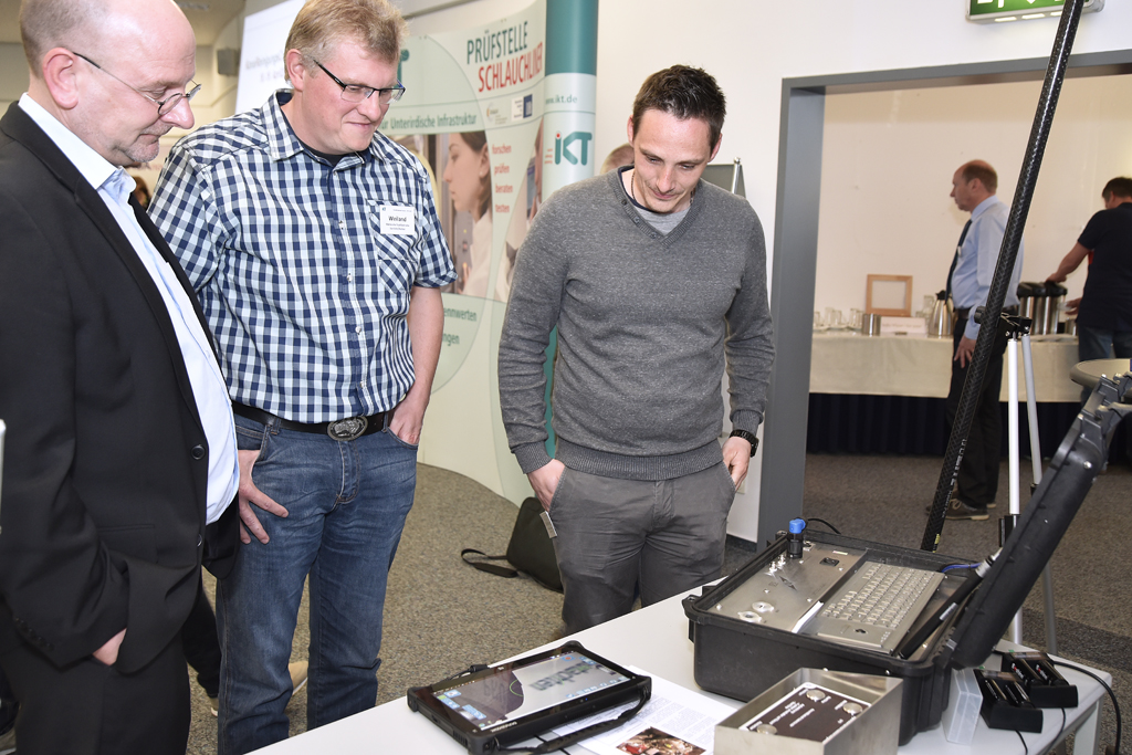 Den Congress begleitete eine große Fachausstellung im Innen- und Außenbereich des IKT. Von der Reinigungsdüse bis zum kompletten Spülfahrzeug, von der Software bis zur Molchstation, von der Schachtzoomkamera bis zum Cutter mit Wasserdruck – die Aussteller präsentierten ihre Produkte und Dienstleistungen an den Stände und in kurzen Ausstellerinterviews, die live auf die große Leinwand übertragen wurden. Live-Vorführungen drinnen und draußen zeigten den Teilnehmerinnen und Teilnehmern die Technik in Aktio. Die Aussteller freuten sich über die vielen guten Gespräche mit den Teilnehmer/-innen und Referent/-innen. Aussteller:- AquaTeq