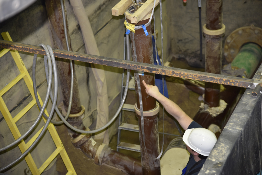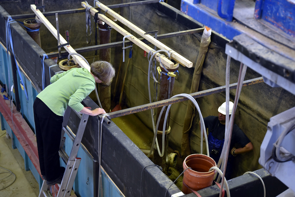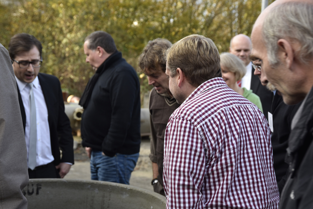 Sanierte und bereits aus dem Großversuchsstand ausgebaute Probekörper konnten die Lenkungskreis-Mitglieder genau unter die Lupe nehmen. Wie sehen die sanierten Stutzen aus? Wo zeigen sich Auffälligkeiten?