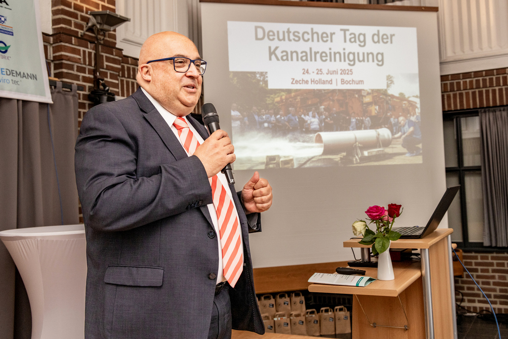 - IKT-Geschäftsführer Roland W. Waniek begrüßt die mehr als 200 Teilnehmer des „Tag der Kanalreinigung 2025“