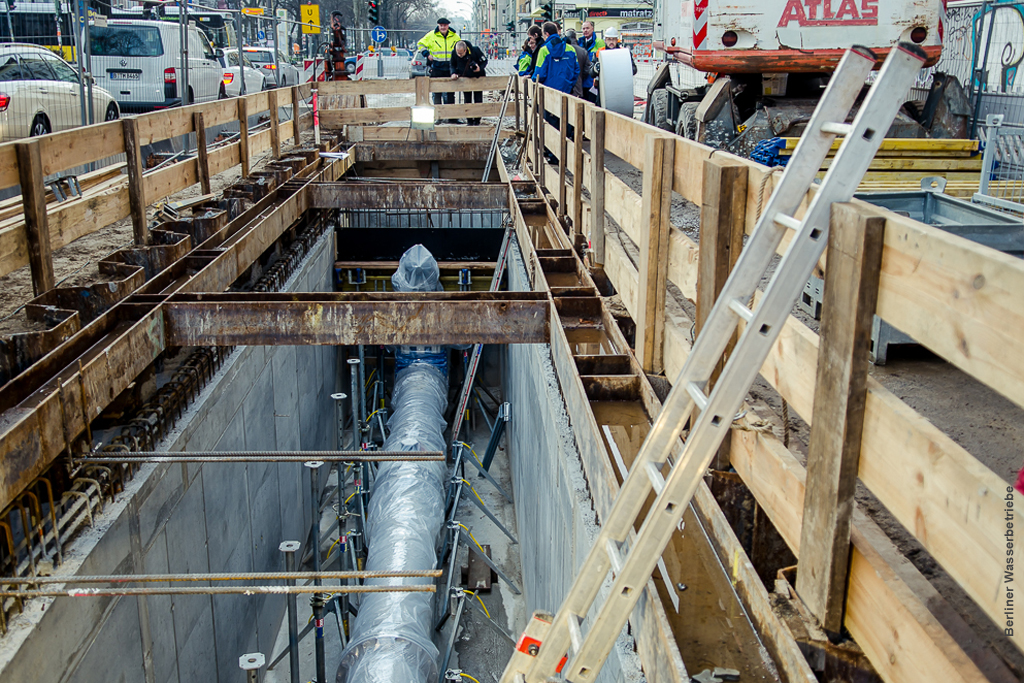 Der „Rest“ – das können zusätzliche 900 Kubikmeter sein – staut sich dann in den Kanälen oberhalb der Drossel und fließt zeitverzögert zum Abwasserpumpwerk. Dieses Pumpwerk kann dann zusammen mit weiteren derzeit entstehenden unterirdischen Staubauten in seinem Einzugsgebiet auch bei Wolkenbrüchen die anfallenden Abwassermengen bewältigen und Überläufe in die Spree vermeiden.Die Arbeiten zu dem rund eine Million Euro teuren Drosselbauwerk sind in vollem Gange und sollen bis April 2015 abgeschlossen sein.