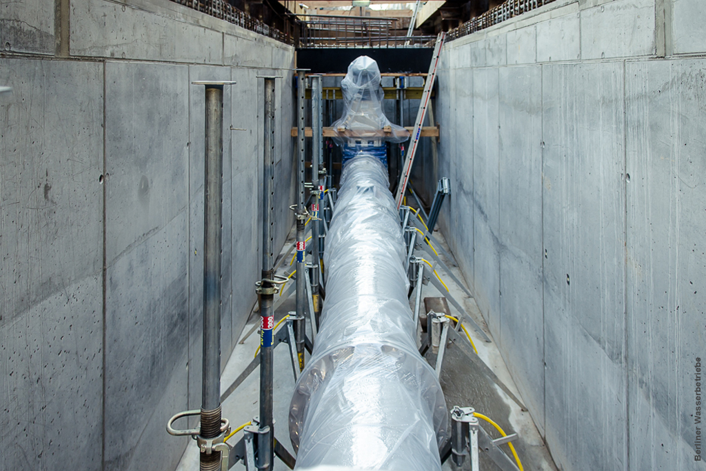 Eine weitere Anlage, die die Spree wieder ein Stück sauberer machen wird, steht in Friedrichshain kurz vor ihrer Vollendung. Dazu bauen die Berliner Wasserbetriebe ein so genanntes Drosselbauwerk in einen zwei Meter hohen Mischwasserkanal. Der 17 Meter lange Trumm verschlankt trompetenförmig und tief im Boden den großen Kanal auf 60 Zentimeter Durchmesser. Mehr als 200 Liter pro Sekunde lässt die Engstelle nicht durch.
