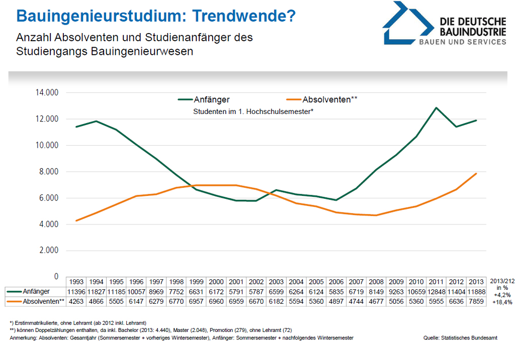 Mit diesen Worten kommentierte RA Michael Knipper, Hauptgeschäftsführer des Hauptverbandes der Deutschen Bauindustrie, in Berlin die jüngsten Zahlen des Statistischen Bundesamtes zu Studienanfänger- und Absolventenzahlen im Bauingenieurwesen. Demnach wurden im Jahr 2013 rund 11.900 Studienanfänger verzeichnet, 480 mehr als noch im Jahr zuvor. Der seit 2007 zu verzeichnende Aufwärtstrend setzt sich damit fort, hat aber das Niveau des Jahres 2011 noch nicht wieder erreicht, in dem bedingt durch die Aussetzung der Wehrpflicht und die Doppelabiturgänge die Studienanfängerzahl mit rund 12.900 auf das höchste Niveau seit der Wiedervereinigung geklettert war.