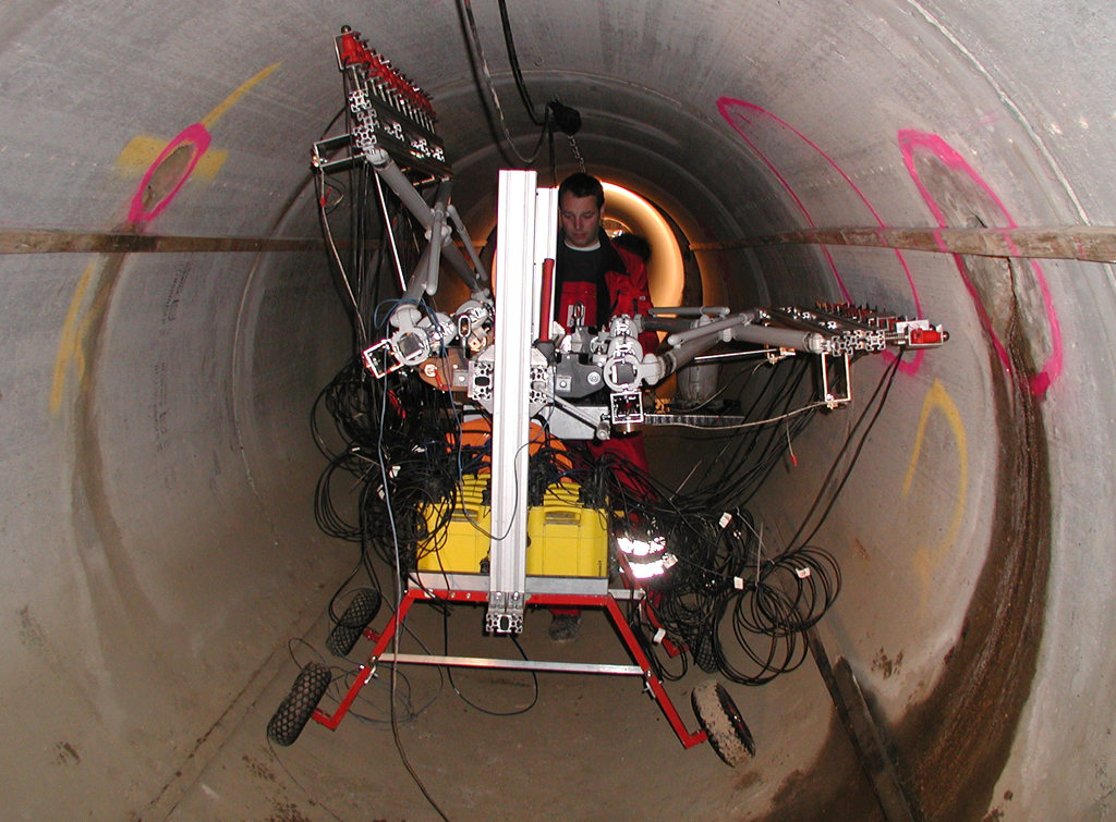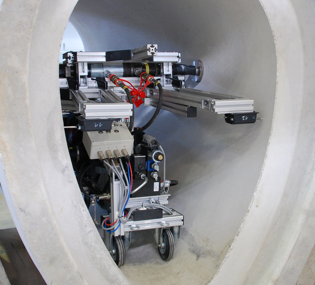 MAC-System im Einsatz: ein Druckzylinder presst gegen die Rohrwandungen, Wegaufnehmer messen die Verformung
