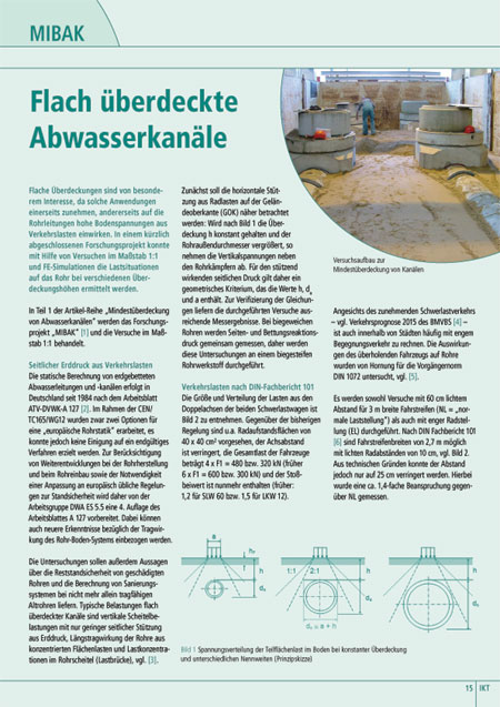 Flache Überdeckungen sind von besonderem Interesse, da solche Anwendungen einerseits zunehmen, andererseits auf die Rohrleitungen hohe Bodenspannungen aus Verkehrslasten einwirken. In einem kürzlich abgeschlossenen Forschungsprojekt konnte mit Hilfe von Versuchen im Maßstab 1:1 und FE-Simulationen die Lastsituationen auf das Rohr bei verschiedenen Überdeckungshöhen ermittelt werden. |