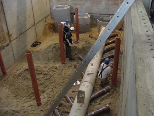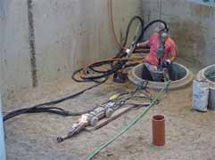 | Hochdruckspülungen in Kanalstrecken dienten anschließend zur Simulation betrieblicher Belastungen der reparierten Anschlussstutzen. Unmittelbar nach der Reparaturdurchführung wurden die im Großversuchsstand des IKT ausgeführten Reparaturen mit Außenwasserdruck (Grundwassersimulation) belastet. Die Dichtheit der Reparaturstellen wurde mit Innenwasserdruck sowohl nach der Reparaturdurchführung als auch nach den Hochdruckspülungen überprüft. Als Zusatzuntersuchungen wurden der Einfluss auf die Abwasserableitung sowie Einwirkungen aus Scherlast und Schwefelsäure untersucht. | ||||||||