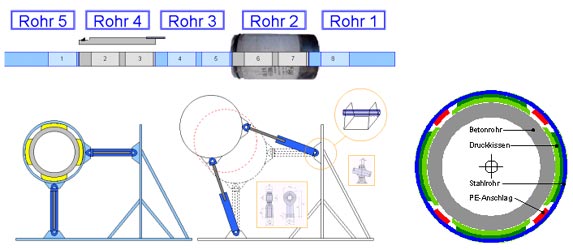 Konzeption der Versuchseinrichtung Zunächst wurden bereits relevante Randbedingungen von Vortrieben mit Stahlbetonrohren recherchiert und Eckdaten für die Modell- und Großversuche unter Berücksichtigung der versuchstechnischen Möglichkeiten und des geltenden Normen und Regelwerkes festgelegt. Des weiteren erfolgte parallel die Aufbereitung der maßgebenden Randbedingungen für Berechnungen mit der Finite-Element-Methode. Diese Berechnungen dienten der Vorabschätzung der voraussichtlichen Rohrbelastung. Im Ergebnis lagen Spannungen am Rohrumfang vor, welche als Basis für die Entwicklung der Versuchseinrichtung dienten. |