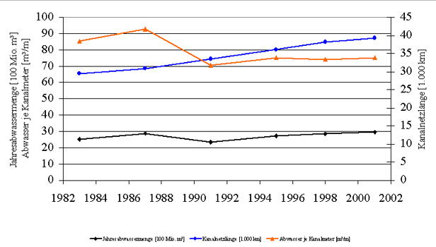 Wie die nachfolgende Abbildung verdeutlicht, unterliegt die Jahresabwassermenge zwar Schwankungen, weist allerdings insbesondere seit Beginn der 90er Jahre einen steigenden Verlauf auf. Die Entwicklung der Produktivität des Kanalnetzes ist rückläufig: Bei insgesamt zunehmenden Jahresabwassermengen fiel die Produktivität von rd. 38 m³ je Kanalmeter im Jahr 1983 auf rd. 34 m³ je Kanalmeter im Jahr 2001. Der Rückgang der Kanalproduktivität ist dabei auf die im Vergleich zu den Jahresabwassermengen überproportional gestiegene Kanalnetzlänge zurückzuführen.