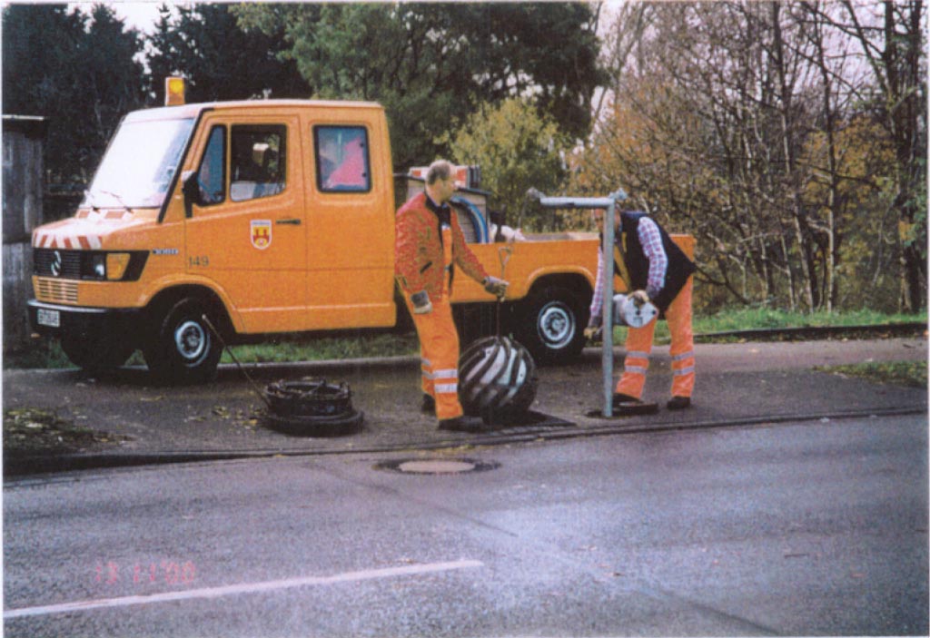 Einfache Anwendung und Handhabung Die Anwendung und Funktionsweise der "Göttinger Kugel" ist denkbar einfach. Die Kugel stellt ein Hindernis für das Abwasser dar und wird mit erhöhter Geschwindigkeit umströmt. Die dabei erzeugten Turbulenzen wirbeln Ablagerungen auf bzw. verhindern neue Ablagerungen. Eine "Göttinger Kugel" wird regelmäßig, zwei bis fünf Mal pro Woche, in den Kanal eingelassen. Von der Abwasserströmung angetrieben rollt sie stromabwärts durch den Kanal und wird meistens kurz vor der Kläranlage wieder entnommen, um erneut oberhalb eingesetzt werden zu können. Notwendig sind zwei Mann Personal, einige Kugeln, ein Pritschenwagen und ein Auffang-Rechen (Bilder 3 und 4).