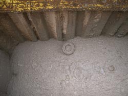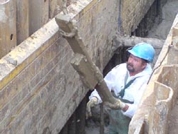 Das Rohrauflager wird punktuell im Bereich der Rohrverbindung mit plastischem Flüssigbodenmaterial (KP) hergestellt. Das plastische Flüssigbodenmaterial wird dabei wie ein klassisches Schüttgut verdichtet. Die Höhe des Rohrauflager soll eine Flüssigbodenverfüllung von mindestens 30 cm auch unterhalb der Sohle des Rohrschaftes ermöglichen. Der Wassergehalt des plastischen Materials (KP) wurde sehr gering eingestellt (nahezu erdfeucht). Hierdurch ließen sich kurze Auflagerbänke (ca. 50-100 cm lang) erzielen. Zur Auftriebssicherung wurde daraufhin eine Holzverstrebung gegenüber dem Verbauelement eingerichtet.