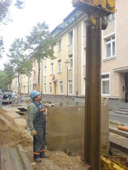 Die Anwenderrichtlinie und der Qualitätssicherungsplan des Systemanbieters sieht das rechtzeitige Ziehen des Verbaus innerhalb von 30 Minuten nach dem Einbau vor. Im Rahmen der Ausschreibung wurde festgelegt, dass der Verbau spätestens nach vier Stunden bis auf das Niveau der Verfüllung zu ziehen ist. Die Baufirmen sollten dies bei der Planung des Bauprozesses beachten und insbesondere bei der Preisbildung berücksichtigen. Hintergrund: Bei beengten Baufeldbedingungen, die ein seitliches Arbeiten von Baugeräten neben dem Rohrgraben kaum zulassen, kann eine Komplettverfüllung des Rohrgrabens mit Flüssigboden, über die Leitungszone hinaus, wirtschaftlich sein (Nebenangebot).